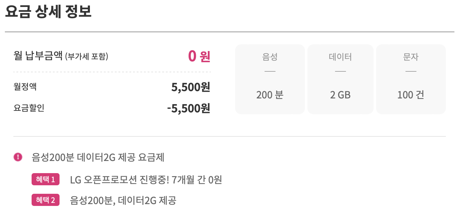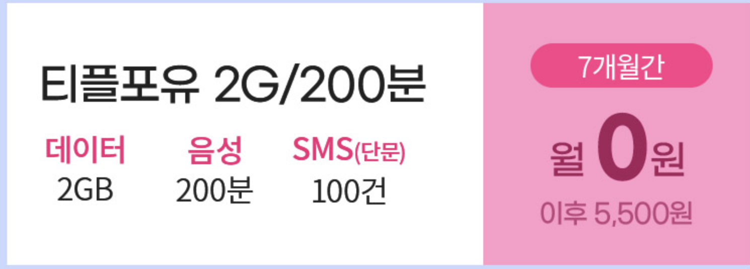 - 요금제명: 티플포유 2G/200분 (LGU+망)