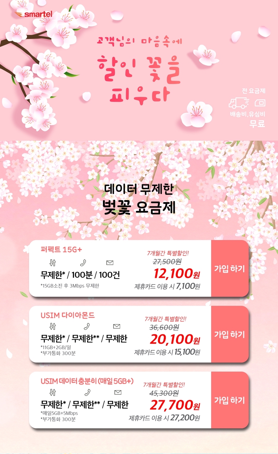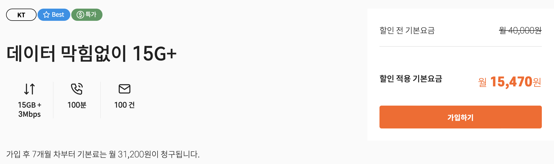 기본제공량: 음성 100분, 문자 100건, 데이터 15 GB + 3 Mbps