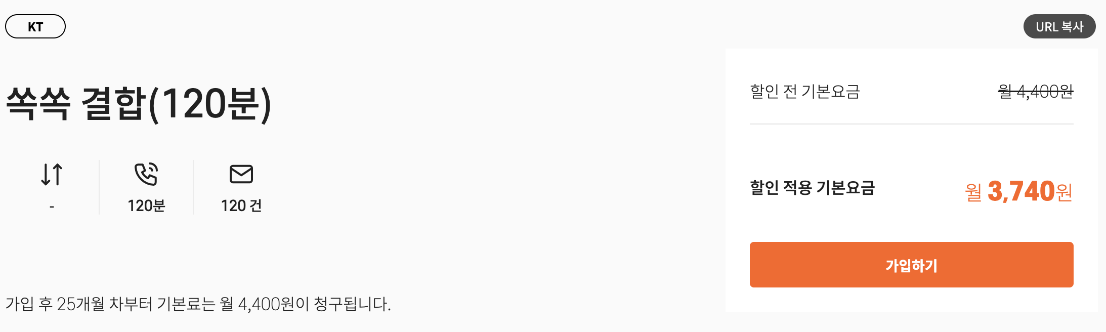 - 요금제명: 쏙쏙결합 120분 (KT망)