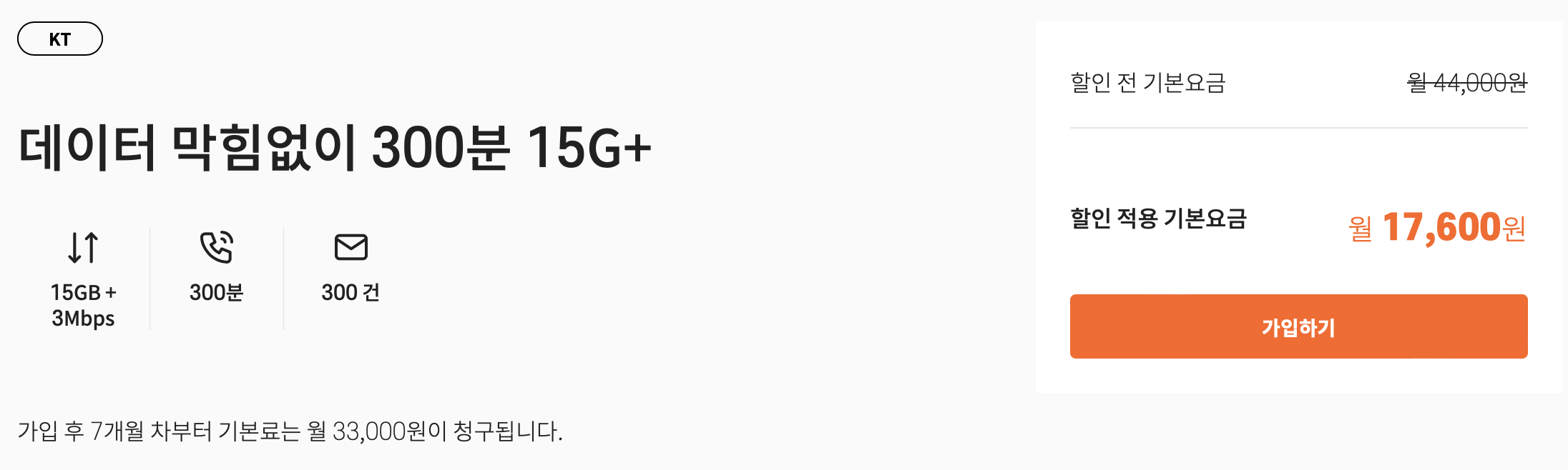 - 요금제명: 이지 15G(300)+/ LGU+/ 월 15GB + 3Mbps, 통화 300분 문자 300건