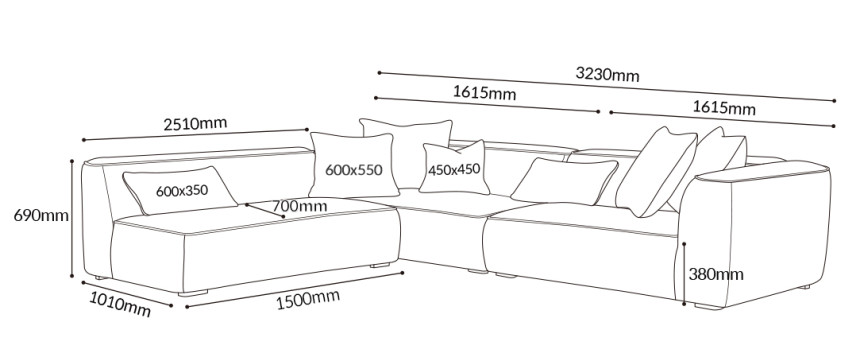 6인 코너형 풀세트 연출시 W(가로) 3230 x D(깊이) 2510 x H(높이) 690
