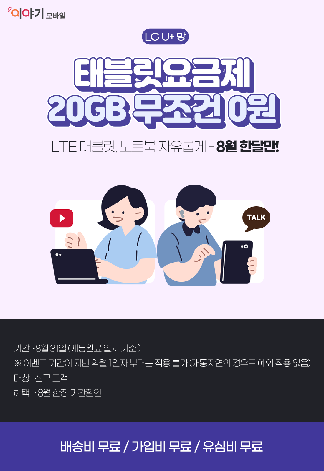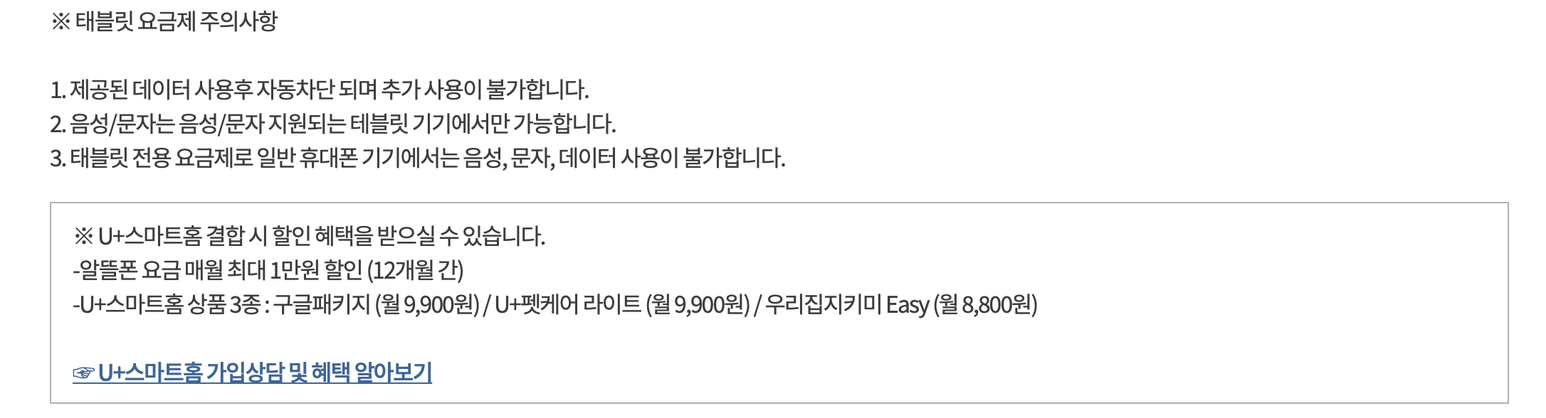 - 태블릿 전용 요금제 : 20GB 6개월간 무료(2022년 1월 31까지) / '22.02.14. 해지