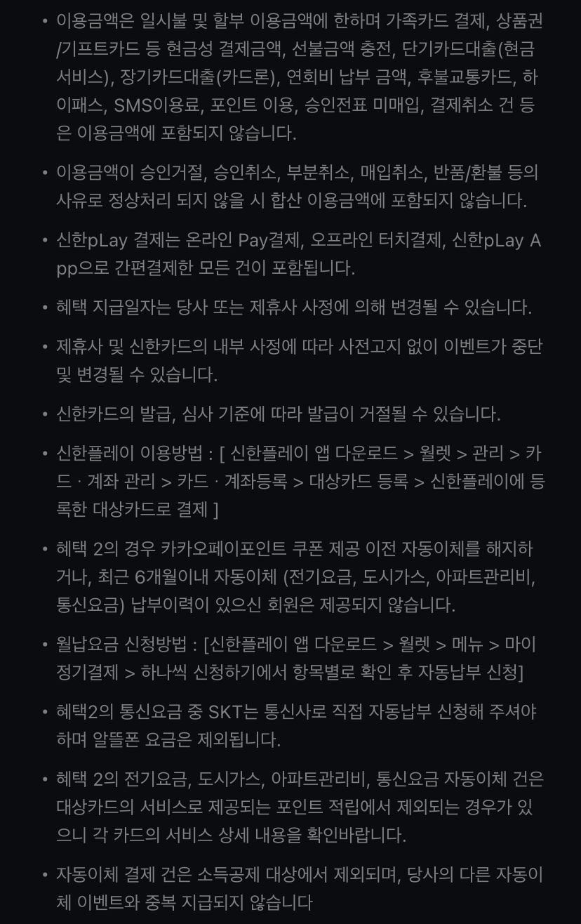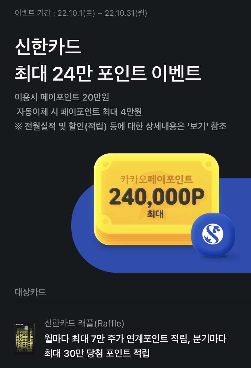 - 이벤트 기간: '22.10.1~11.30. 동안 20만원 이상 사용 & 신한pLay 1건이상 결제 > '22.12.30.에 포인트 20만원 지급
