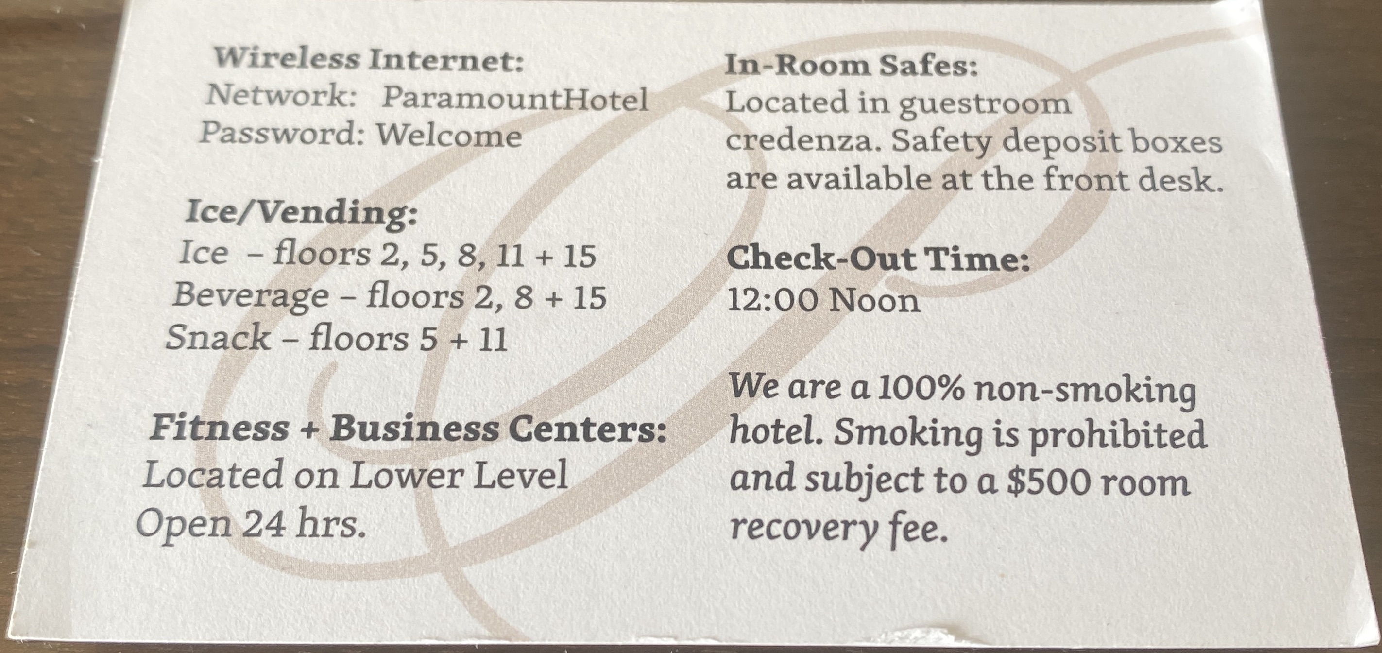 지하 1층에 화장실, 조그마한 피트니스와 비지니스 센터가 위치해 있다. 몇개 층마다 층의 가운데에 음료수/과자 자판기, 얼음기계 등이 비치되어 있다.