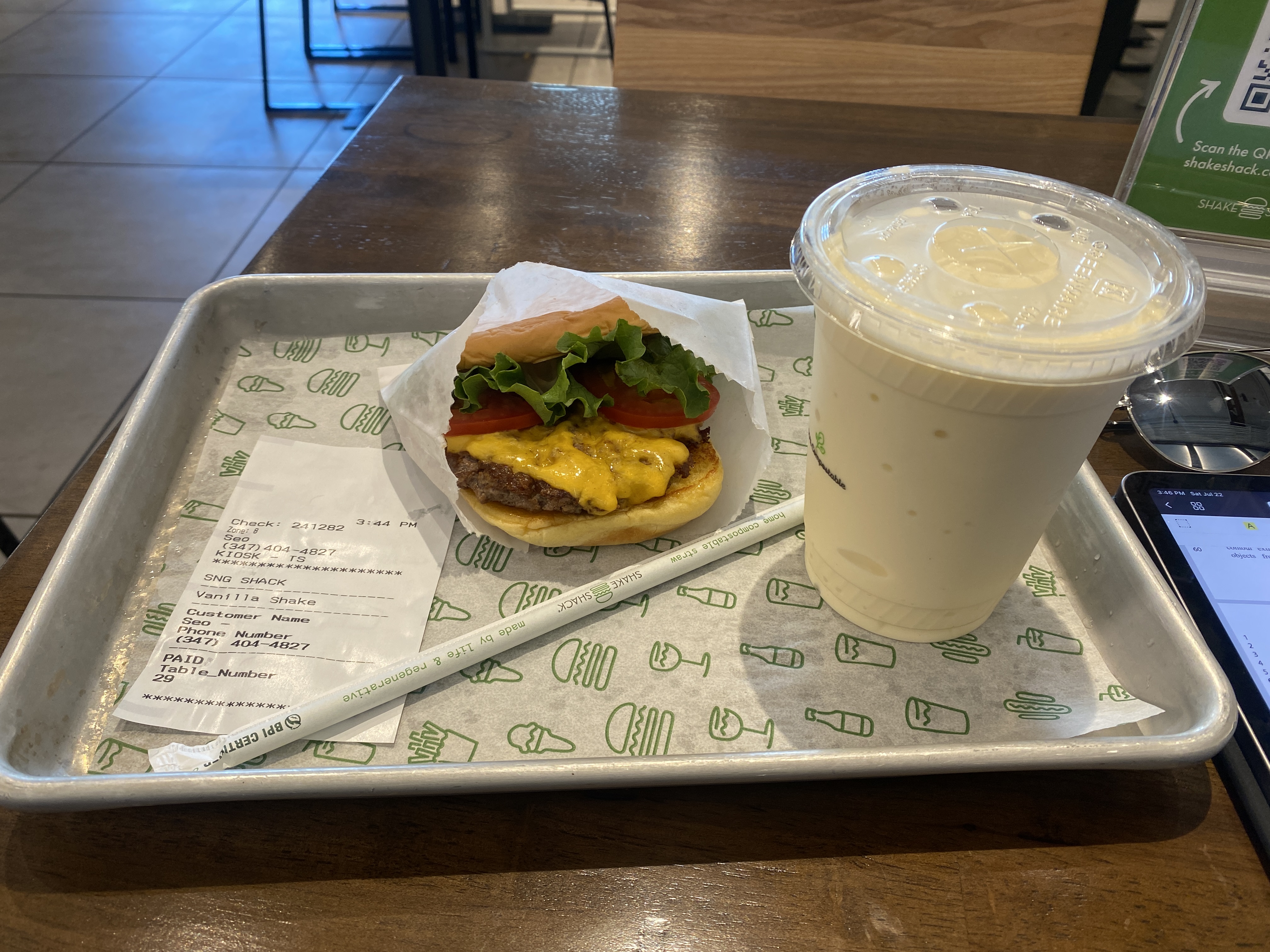 배고프지는 않아서 가장 기본적인 Shack Burger와 vanilla shake를 주문했다. 역시나 버거는 짜지만 맛있고, 쉐이크는 달고 맛있다 ㅋ