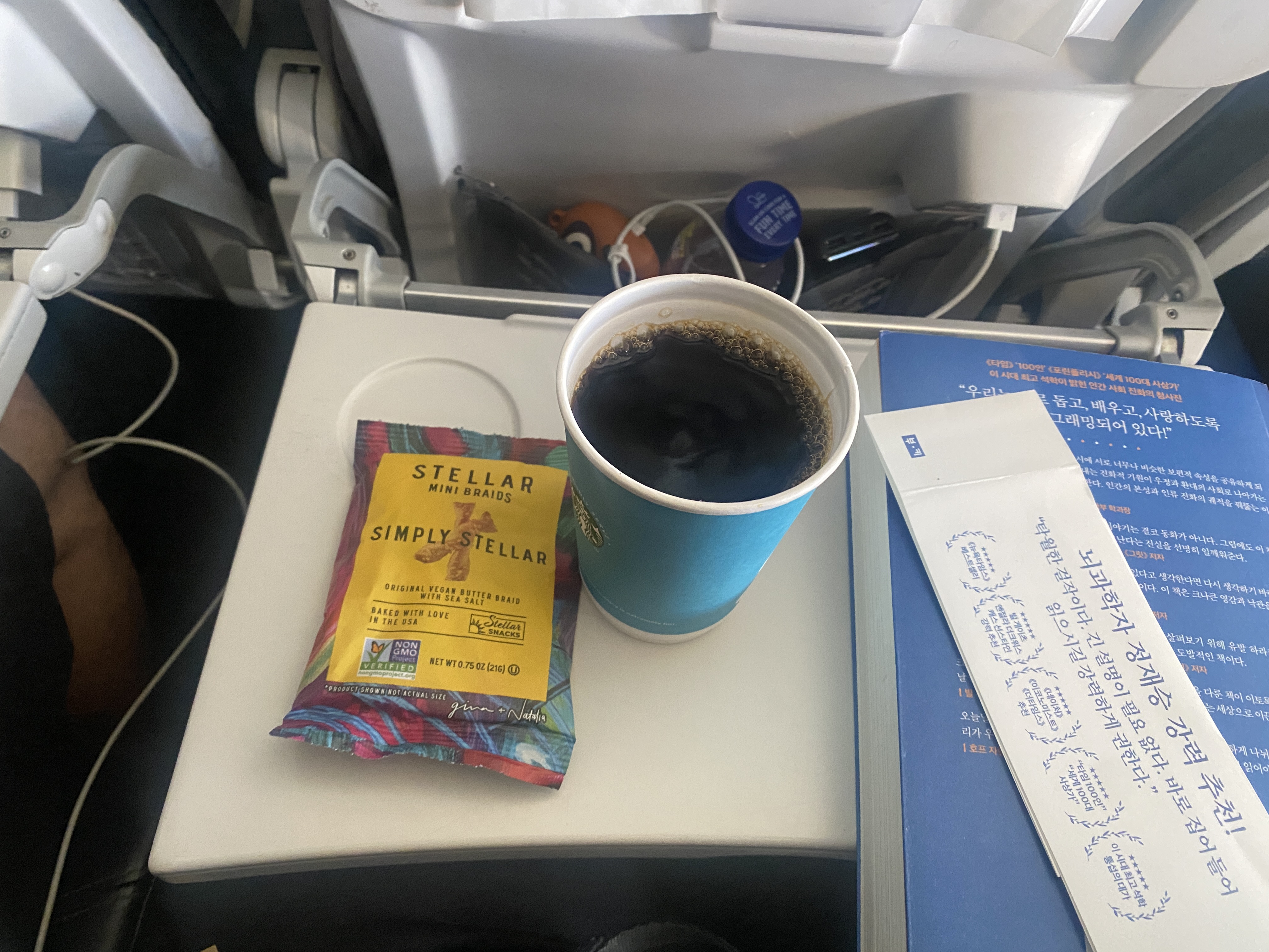 비행기가 뜨고 안정적인 고도가 되자 조그마한 스낵과 음료를 나눠주었다. 뭐 그냥 그렇다... 좌석에 콘센트와 USB를 꼽을 수 있도록 되어 있어 비행시간 동안 휴대폰 충전도 가능했다.