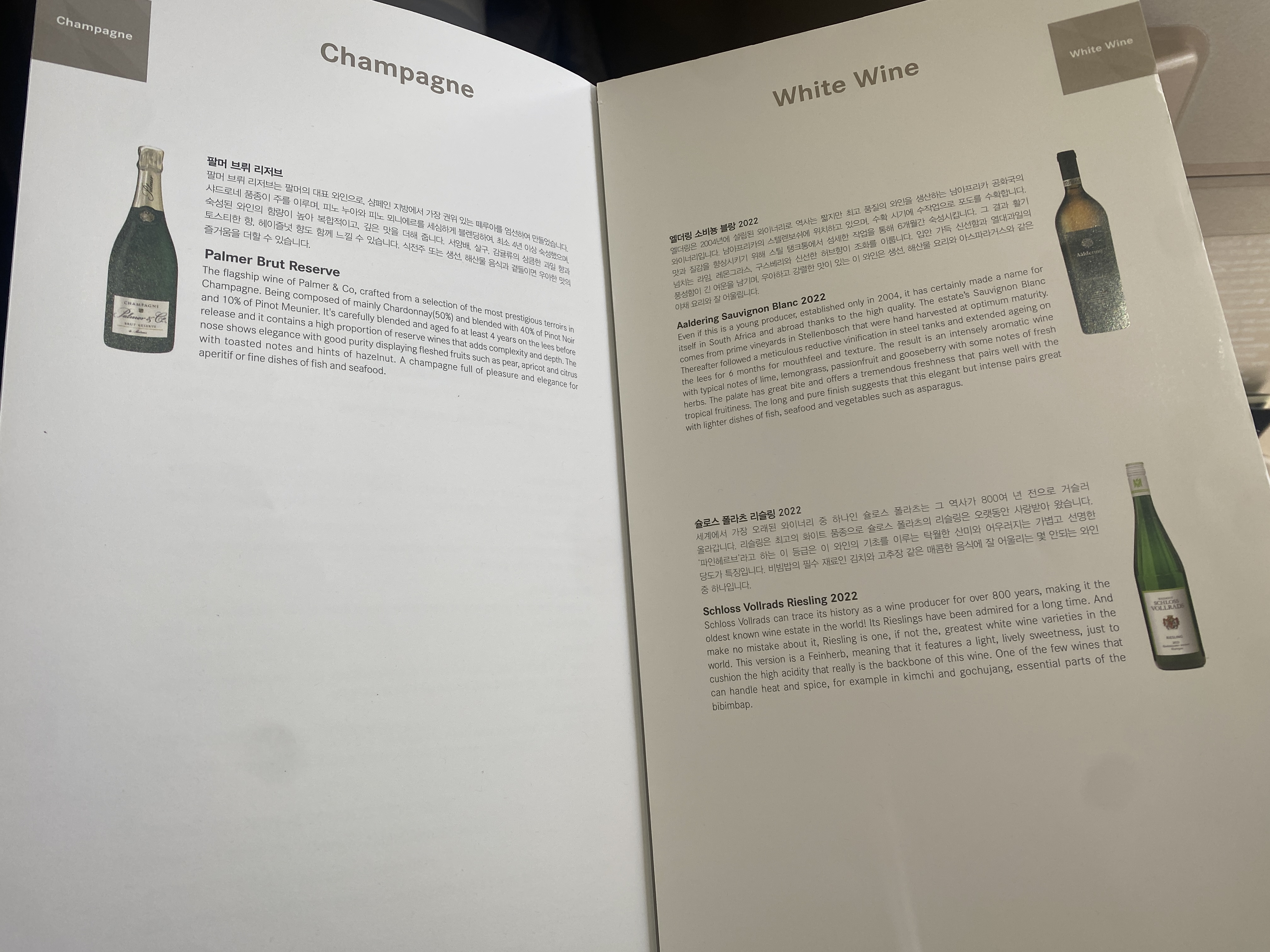비지니스석 승객들이 대부분 좌석에 앉고난 다음 승무원들이 와인, 음료, 물 등을 웰컴 드링크로 나눠준다. 스파클링 와인으로 가볍게 한잔하고 시작~