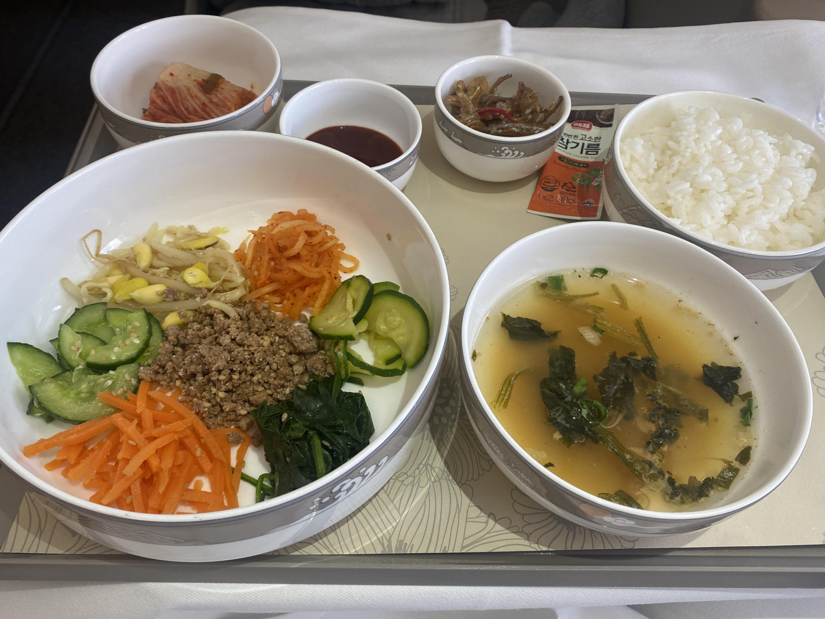 잠시후 승무원이 패드같은 것을 가지고 직접 승객들에게 점심식사로 뭘 먹을지 일일히 물어보았다. 점심식사 메뉴로 양식과 한식 딱 2가지 메뉴가 있다. 평소 한국에 있다가 해외로 나가거나 들어오는 경우면 주로 양식을 먹었겠지만, 10개월 가량을 호주에서 살다가 한국으로 들어가는 거라 한식으로 골랐다.