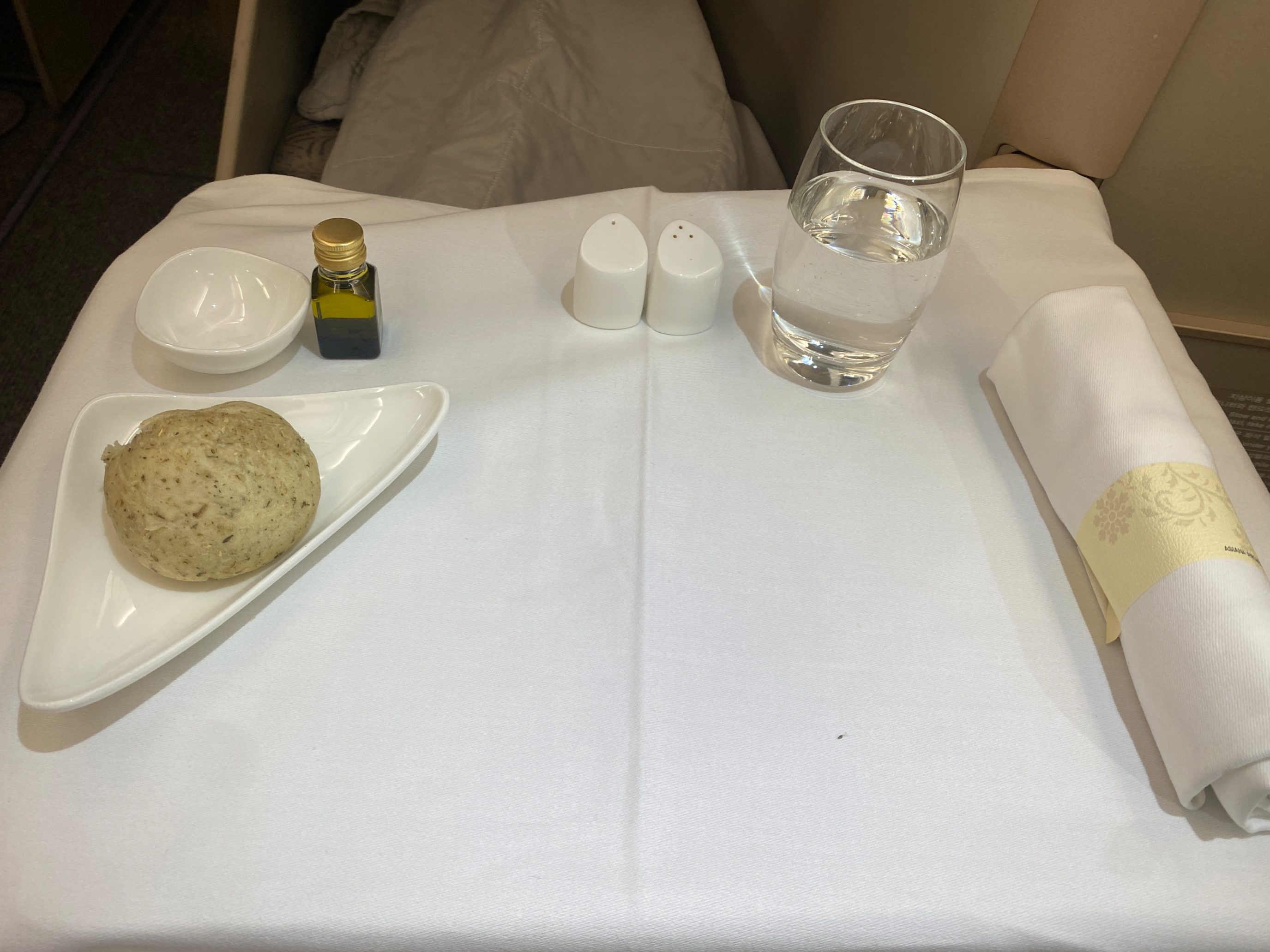 도착하기 전에 마지막 식사가 제공되었다. 식탁보 다시 깔아주고 빵과 발사믹 식초부터 준다. 중간의 소금과 후추통도 아기자기하다.