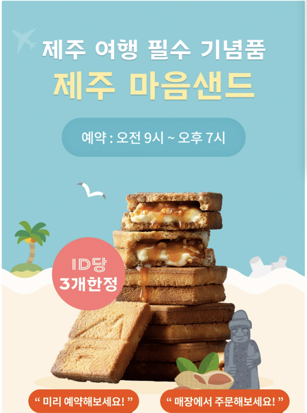 제주공항에서 파는 제주 마음샌드가 한 때 인기여서 미리 예약하지 않으면 구입이 불가능해서 이번에는 제주공항에 도착하자 마자 예약하는 방법을 검색해 보았다. D-3 ~ D-1 전에 파리바게뜨 앱에서 예약하고 당일 오전 9시~오후7시 사이에 픽업하면 된다. 하지만 우리가 복귀하는 비행기는 밤 9:30 출발이라 7시전에 픽업이 어려워서 이번에도 그냥 포기했다.