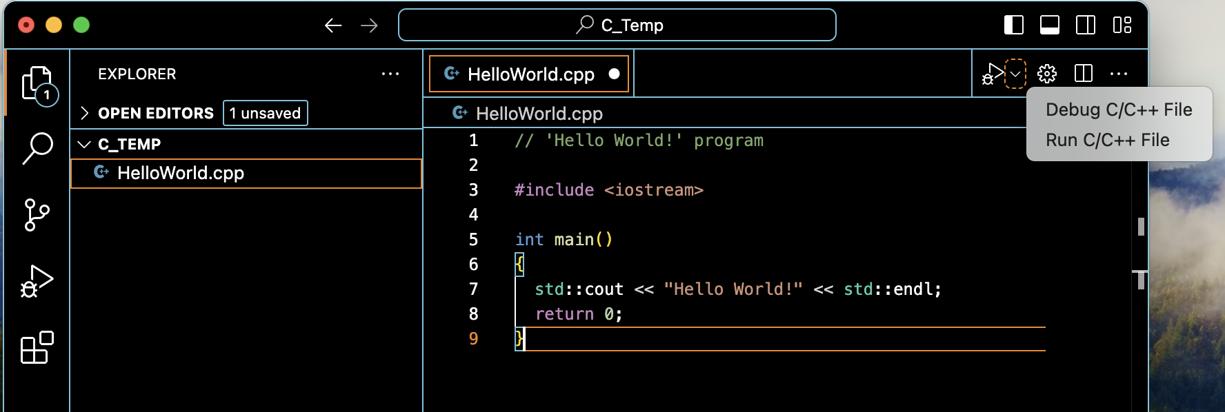 Folder 이름 옆의 'New File' 아이콘을 클릭해서 새로운 .cpp 파일을 만들고, Editor에서 Hello World 코드를 채워 넣는다.