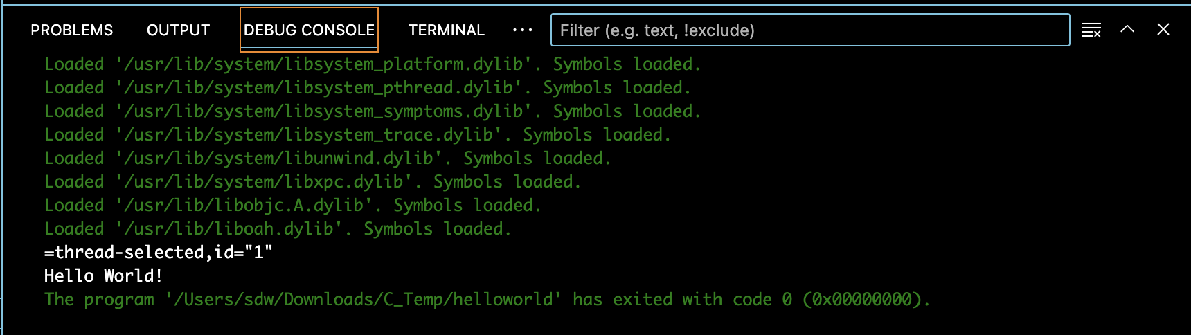 상단의 오른쪽의 버튼을 눌러서 'Run C/C++ File'을 클릭해서 실행할 수 있다. 아래와 같이 'Debug Console'에서 실행 결과를 확인할 수 있다.