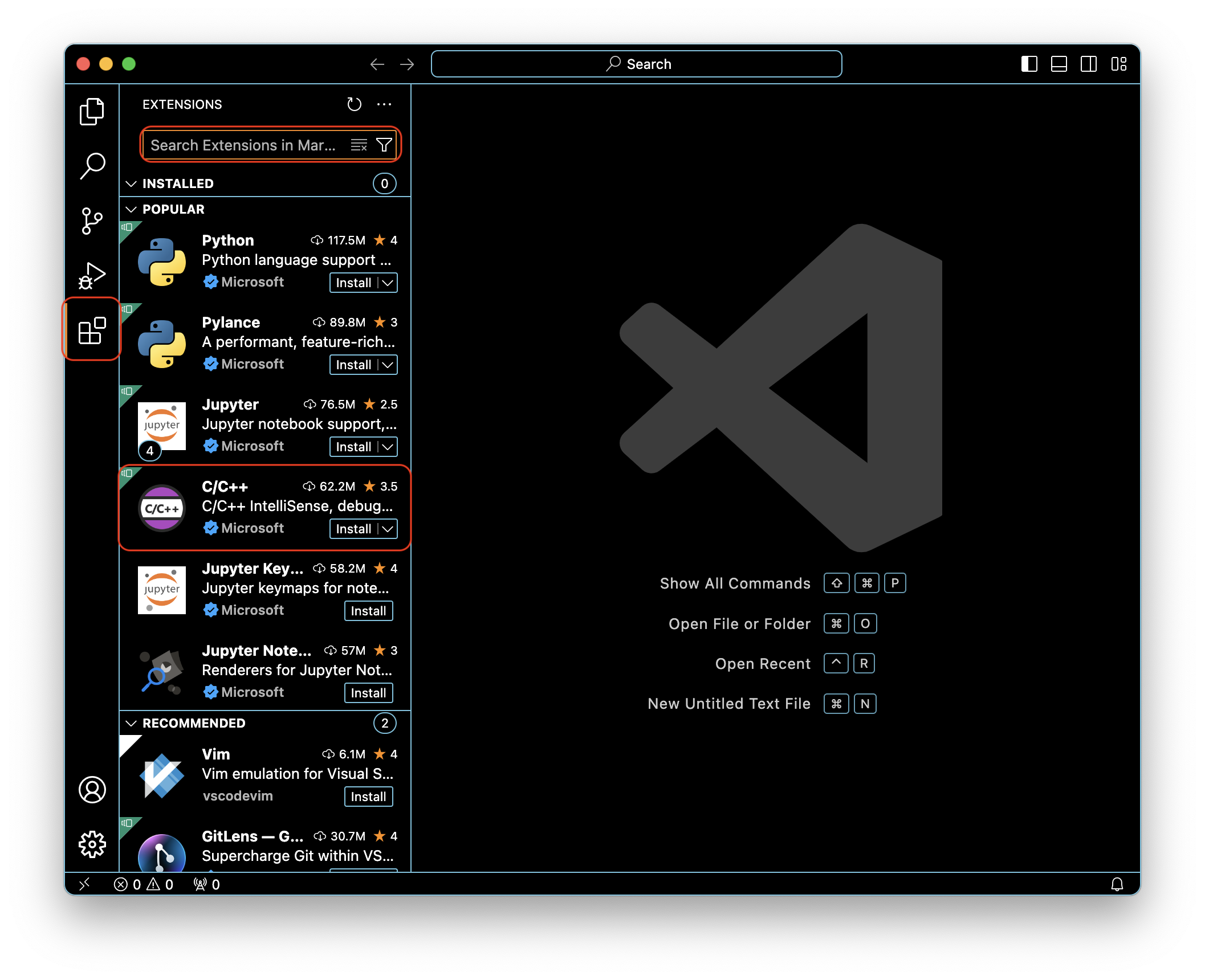위 그림의 Extension중 4번째 위치한 'C/C++'을 설치해준다. 'C/C++' Extension은 C나 C++ 개발할 때 변수명이나 함수 등을 적을 때 도와주거나 Mac에 설치된 Compiler와 연결해주는 역할 등을 한다.