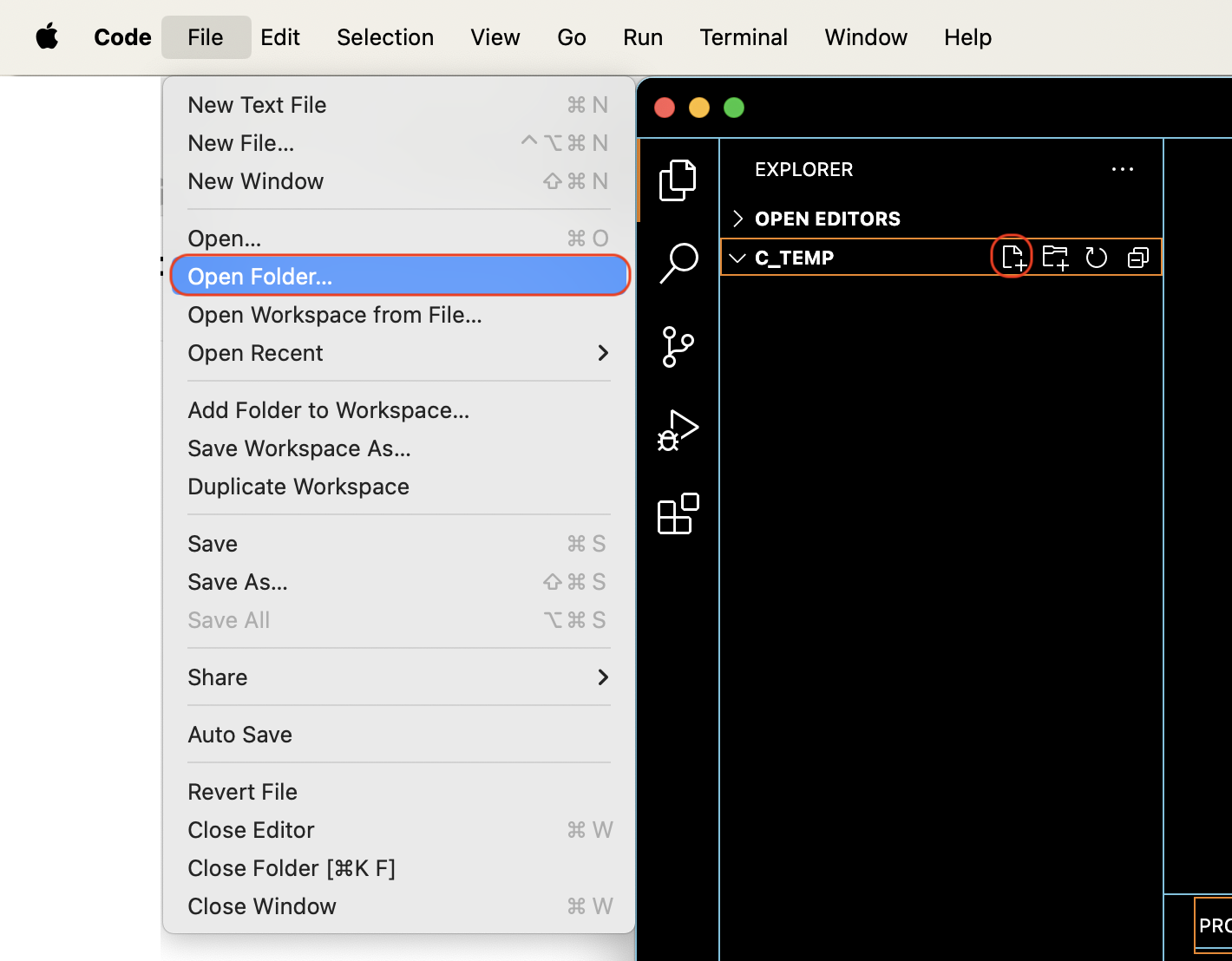먼저 C++ 파일을 저장할 폴더를 Finder에서 생성하고, VS code의 'Menu-File-Open Folder'를 통해 Folder 부터 선택한다. 'C_TEMP'라는 폴더를 선택하면, 오른쪽과 같이 VS Code의 Explorer 화면 밑에 C_TEMP라는 폴더가 불러졌음을 확인할 수 있다.