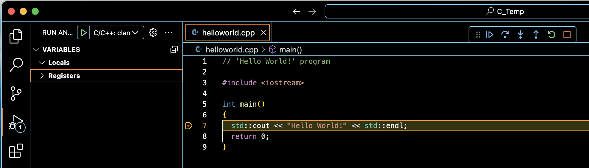 디버그를 위해서는 Fn+F9 또는 마우스로 BreakPoint를 찍고 'Debug C/C++ File'을 누르면 디버깅이 가능하다. 아래처럼 BreakPoint에 멈추고 왼쪽의 Debug 참에서 관련 변수의 값들을 확인할 수 있다. 아래 예제는 확인할 변수가 없다.