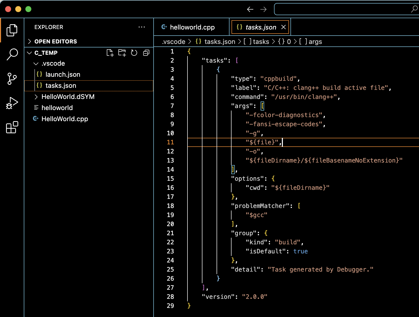 폴더안에 여러개 cpp파일이 있는 경우 같이 빌드하기 위해서는 'tasks.json'을 수정해줘야 한다. 먼저, Explorer의 '.vscode' 폴더 밑의 'task.json'을 선택해서 'task.json' 내용에서 "args"중 "${file}"을 "${workplaceFolder}/*.cpp"으로 변경하면 된다.