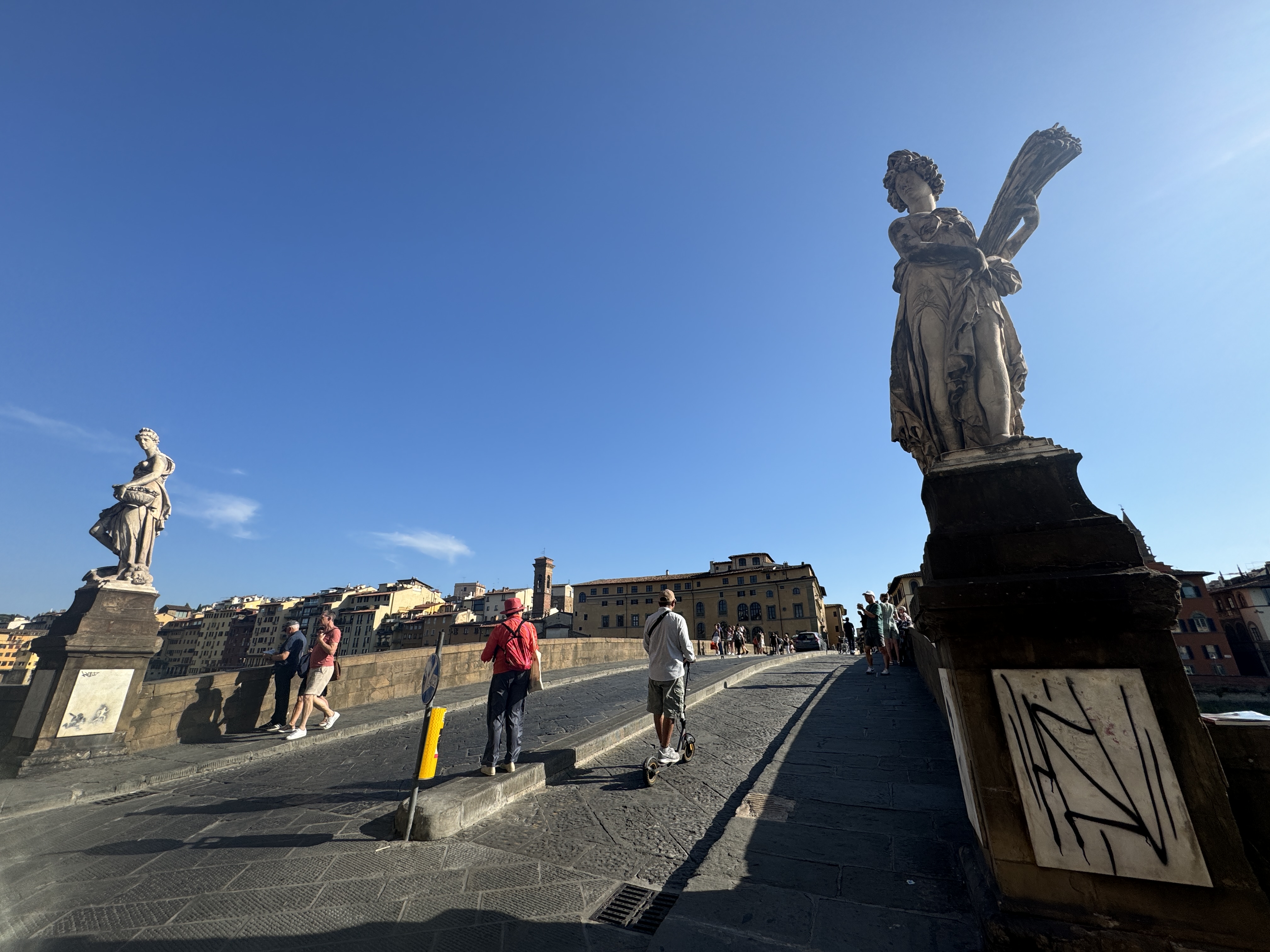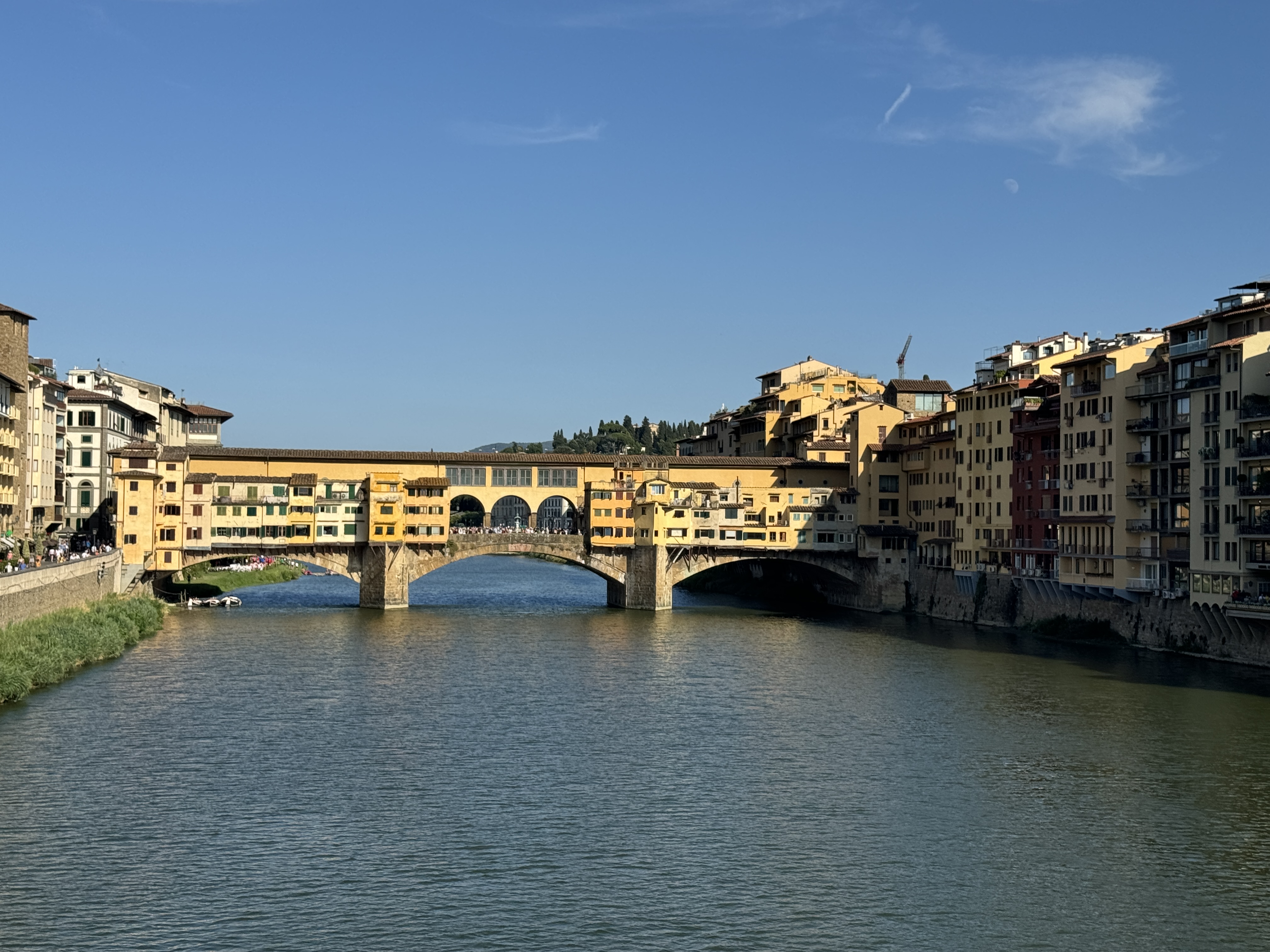 앞에서 설명한 것과 같이 베키오 다리는 우피치 미술관과 연결된 베키오궁과 피티궁을 연결하는 통로가있는 다리로 1345년 피렌체에서 가장 오래된 다리이며, 2차세계대전 때 히틀러가 이 다리는 폭파하지 마라고 해서 남아있다고 가이드가 이야기해주었던 듯하다. 베키오 다리가 이쁘다기 보다는 저 다리위에 또 2층 건물들을 어거지로 구겨넣은 모습이 특이해서 좋아하는 듯하다.