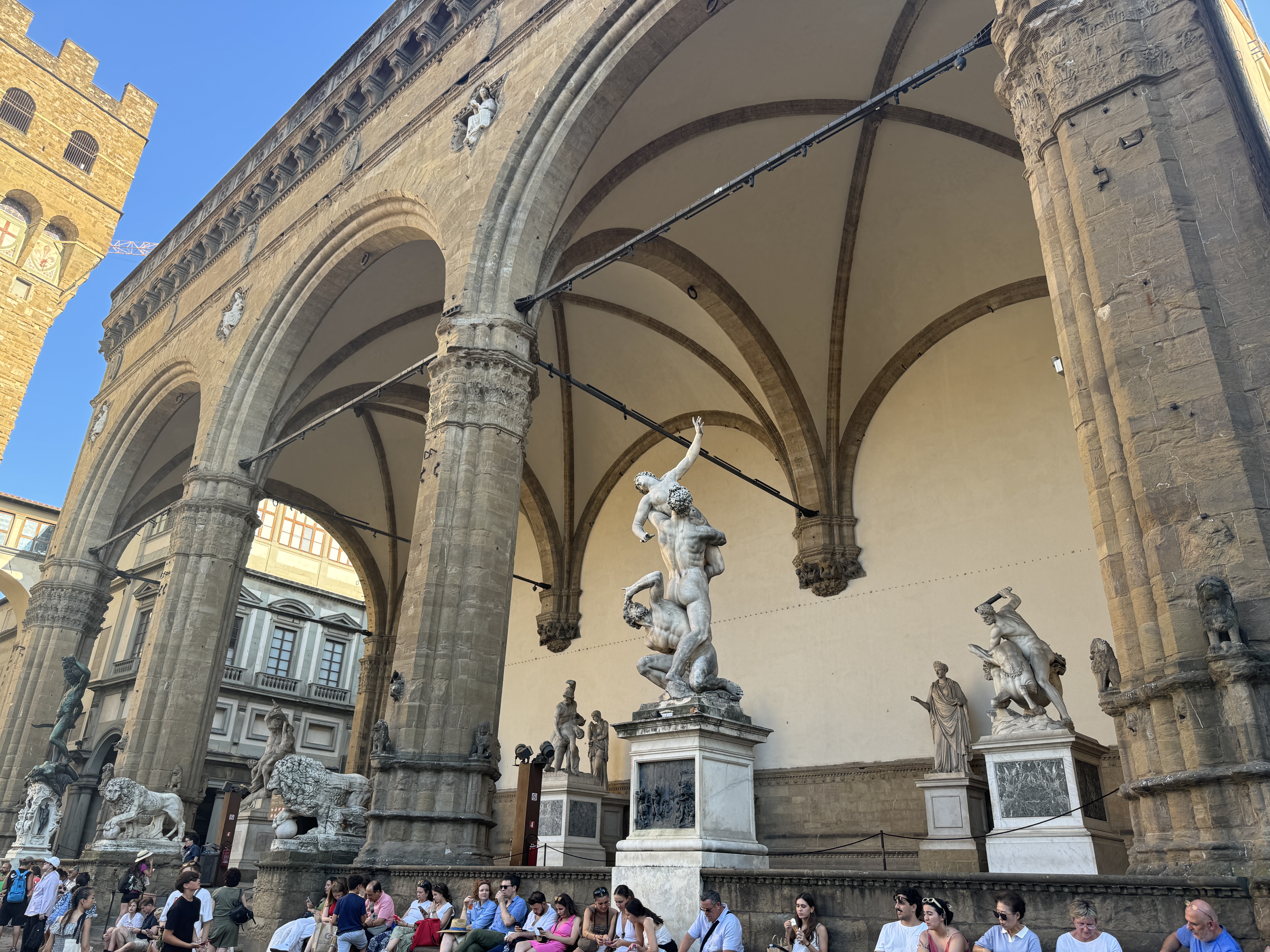 아래 조각상만 진짜라는데 '겁탈당한 사비나 여인'이라는 조각상으로 사방에서 볼 수 있게 제작한 르네상스 최초의 작품으로 벨기에 출신의 조각가 잠볼로나가 만들었다고 한다.