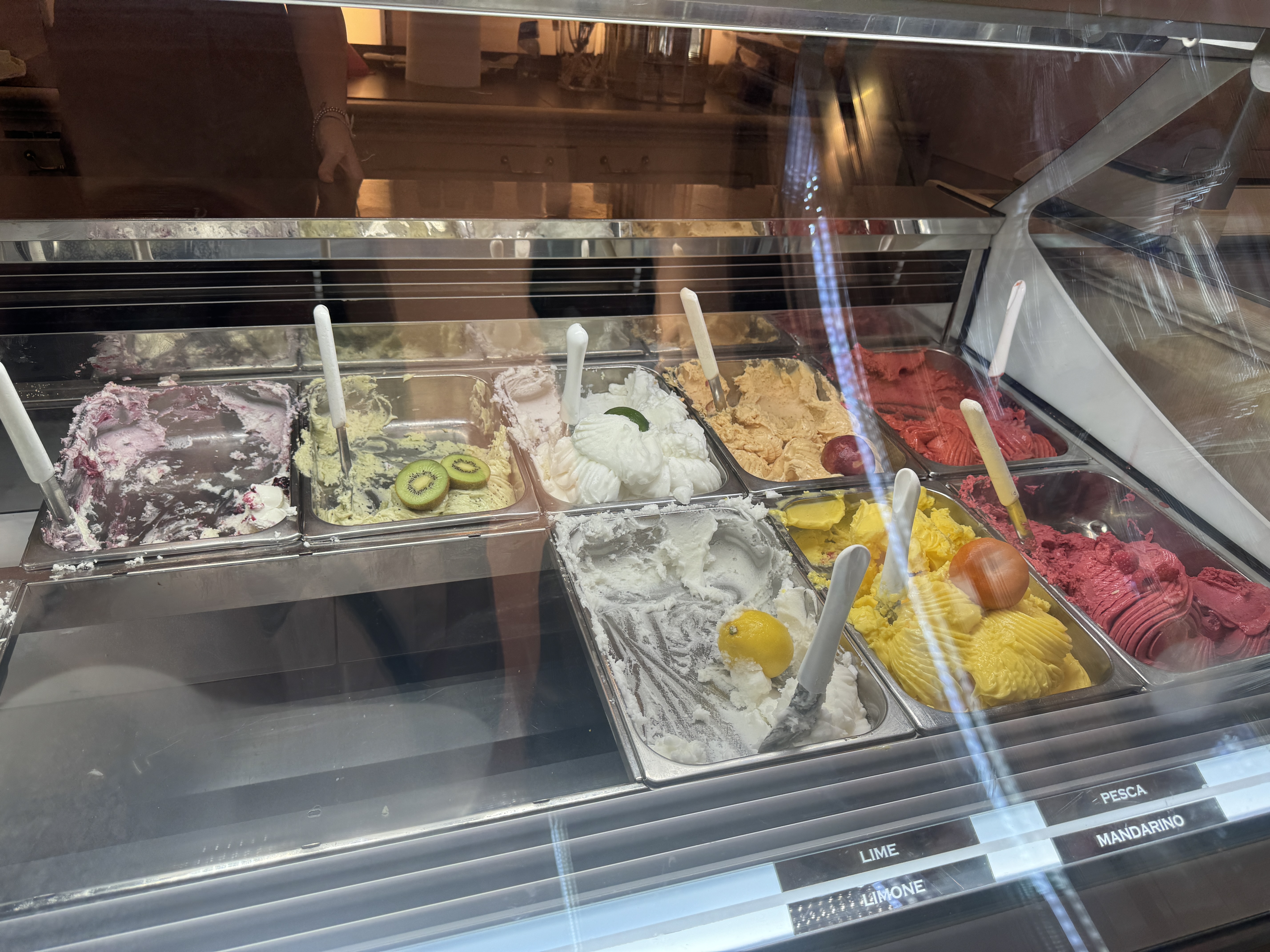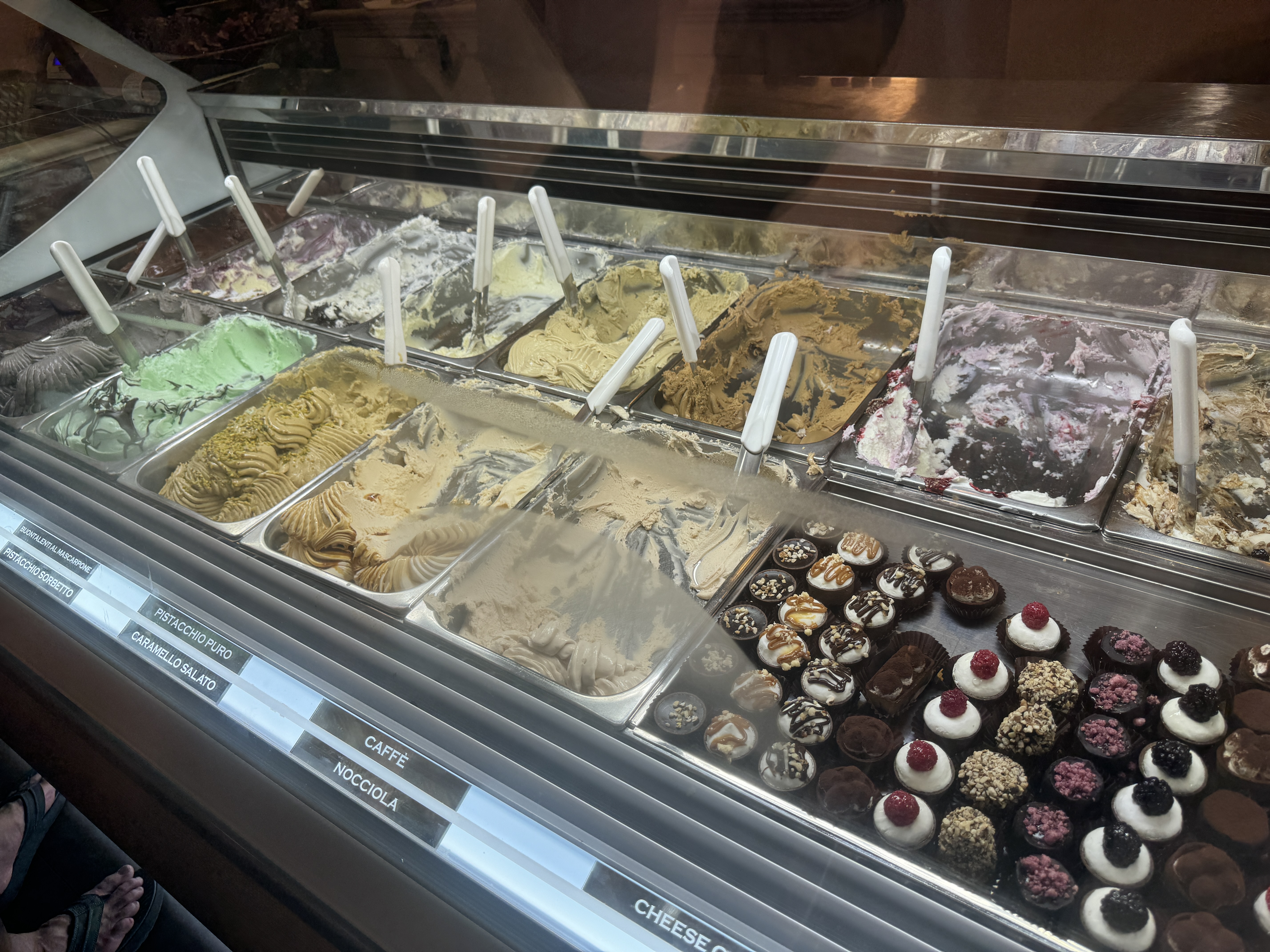 왼쪽에는 치즈, 커피, 피스타치오, 카라멜 젤라또 들도 있다.