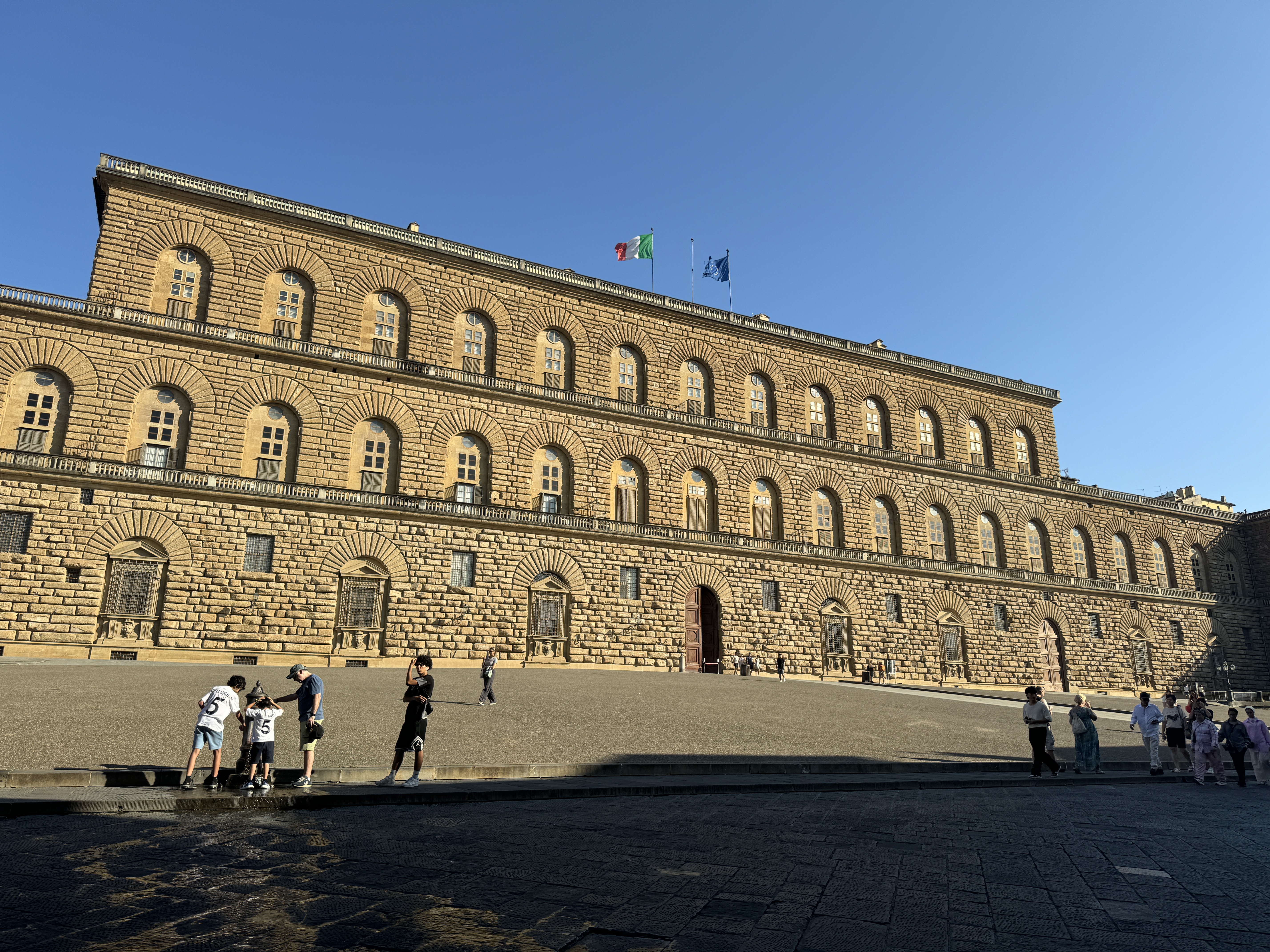 베키오다리 2층의 통로를 따라 다리를 건너 계속가면 피티 궁전이 나온다. 피렌체에 있는 궁전 중 가장 큰 궁전으로 궁전안은 매표소에서 입장권을 구입해야 들어갈 수 있다. 7월 피렌체의 날씨가 너무 더워서 여기서 더 여행하는 것도 힘들어서 앞에서 기념사진만 찍고 돌아왔다.
