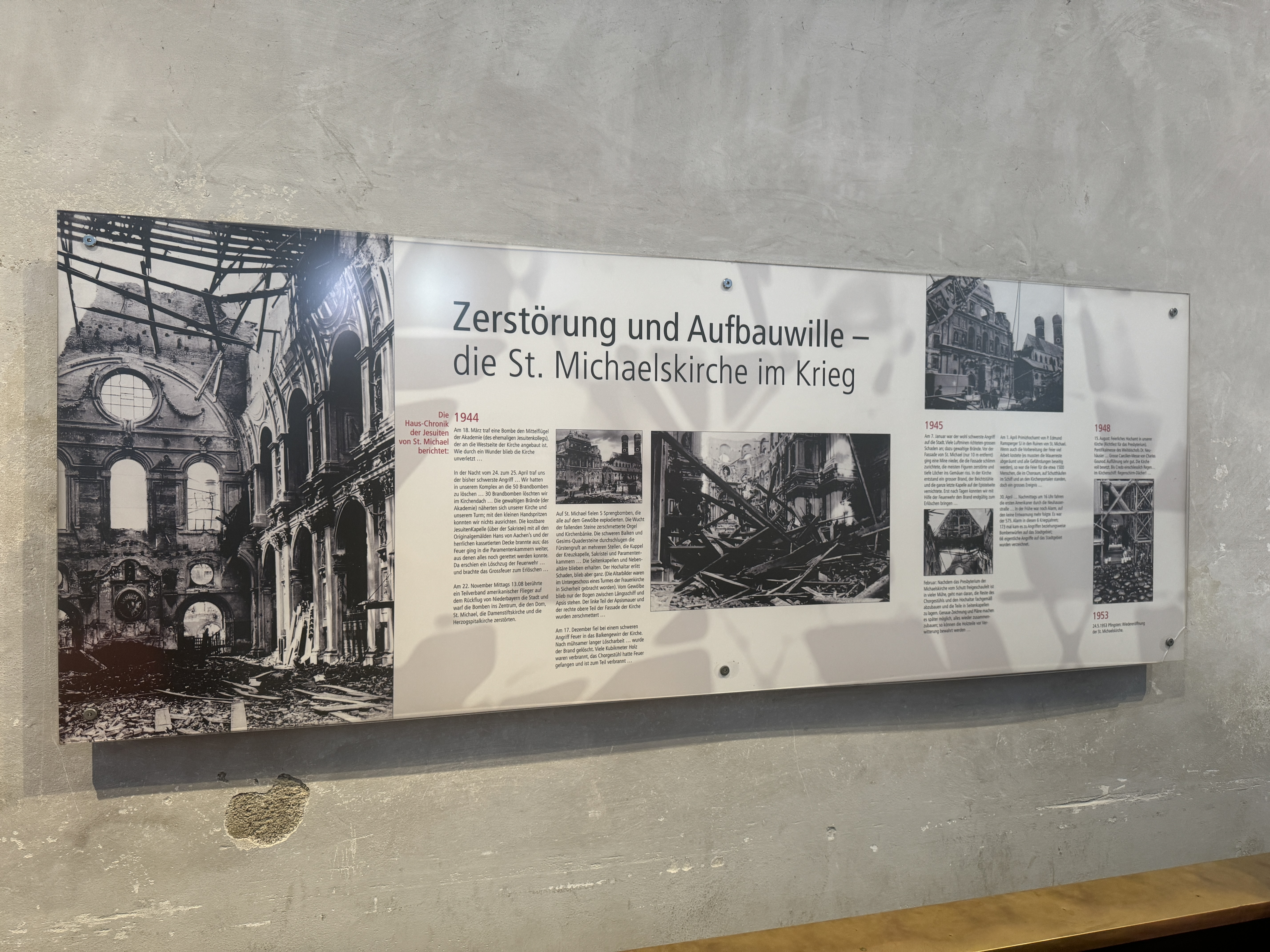 성당 뒤에 간판에는 1944년 2차 세계대전때 이 교회가 폭격으로 폐허가 되어 1948년에 우산을 쓰고 예배를 보는 사진 등이 있다.
