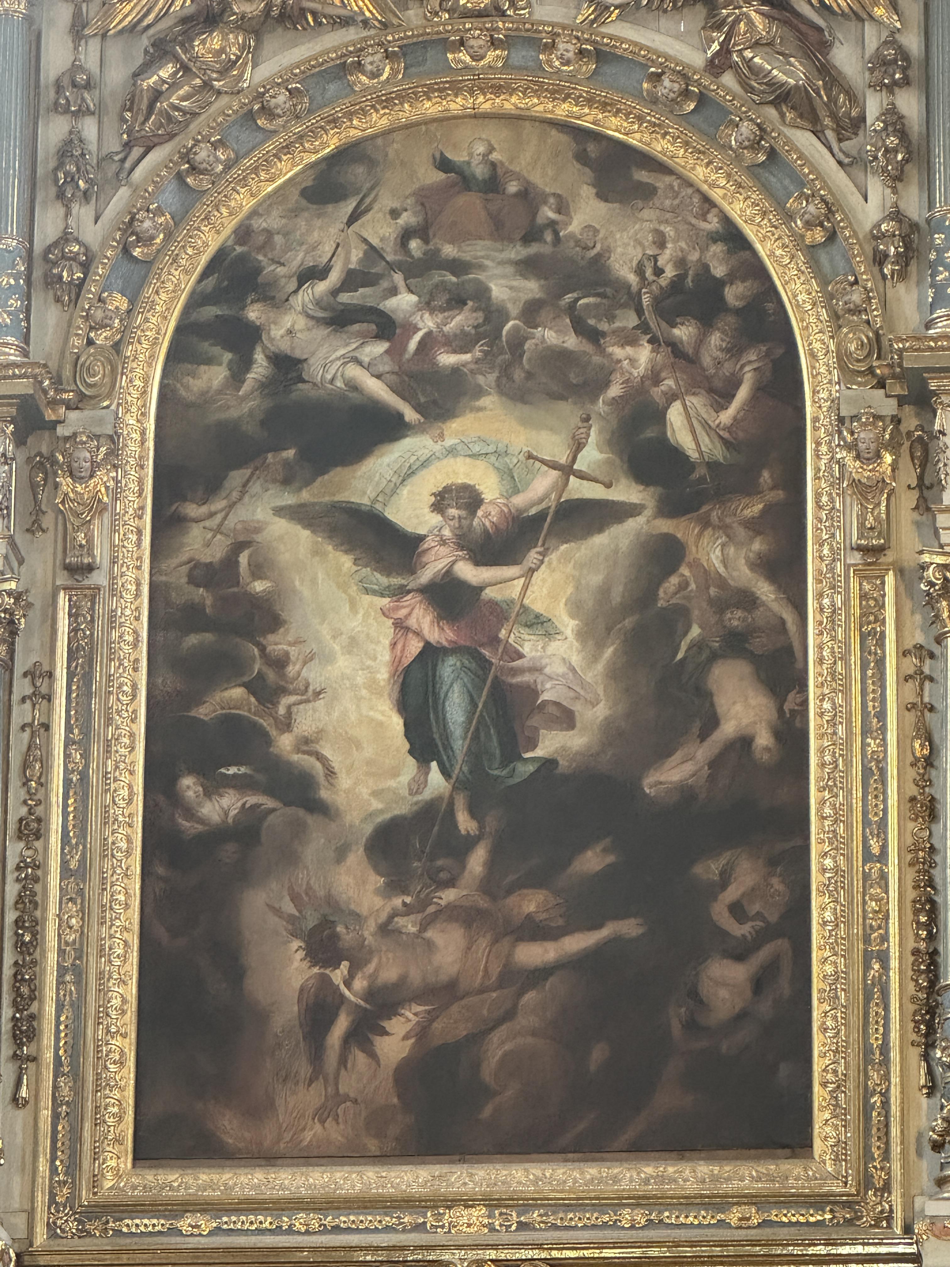 아래는 제단의 그림으로 기독교나 성서에 문외한이지만... 대천사 미카엘 (미하엘)이 타락천사 루시퍼를 무찌르는 내용이라고 한다. 발아래 있는 것이 타락천사라서 날개가 있다고 설명해준 듯하다.