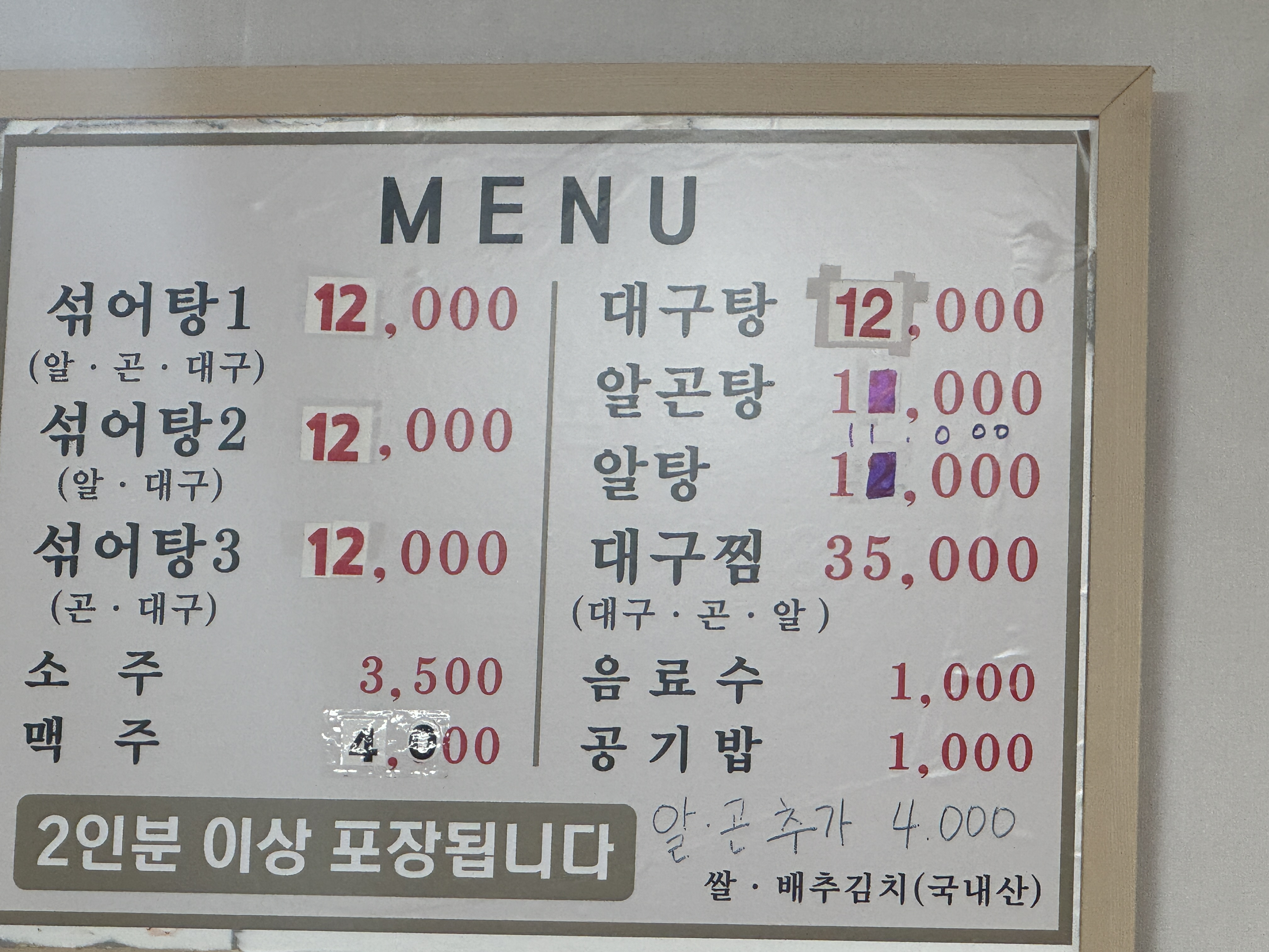 메뉴는 대구탕, 알곤탕, 섞어탕 등이 있다. 잘 모르면 가장 첫번째 메뉴를 시키기 때문에 섞어탕1을 주문했다 알, 곤, 대구가 다 들어가 있는 모양이다.
