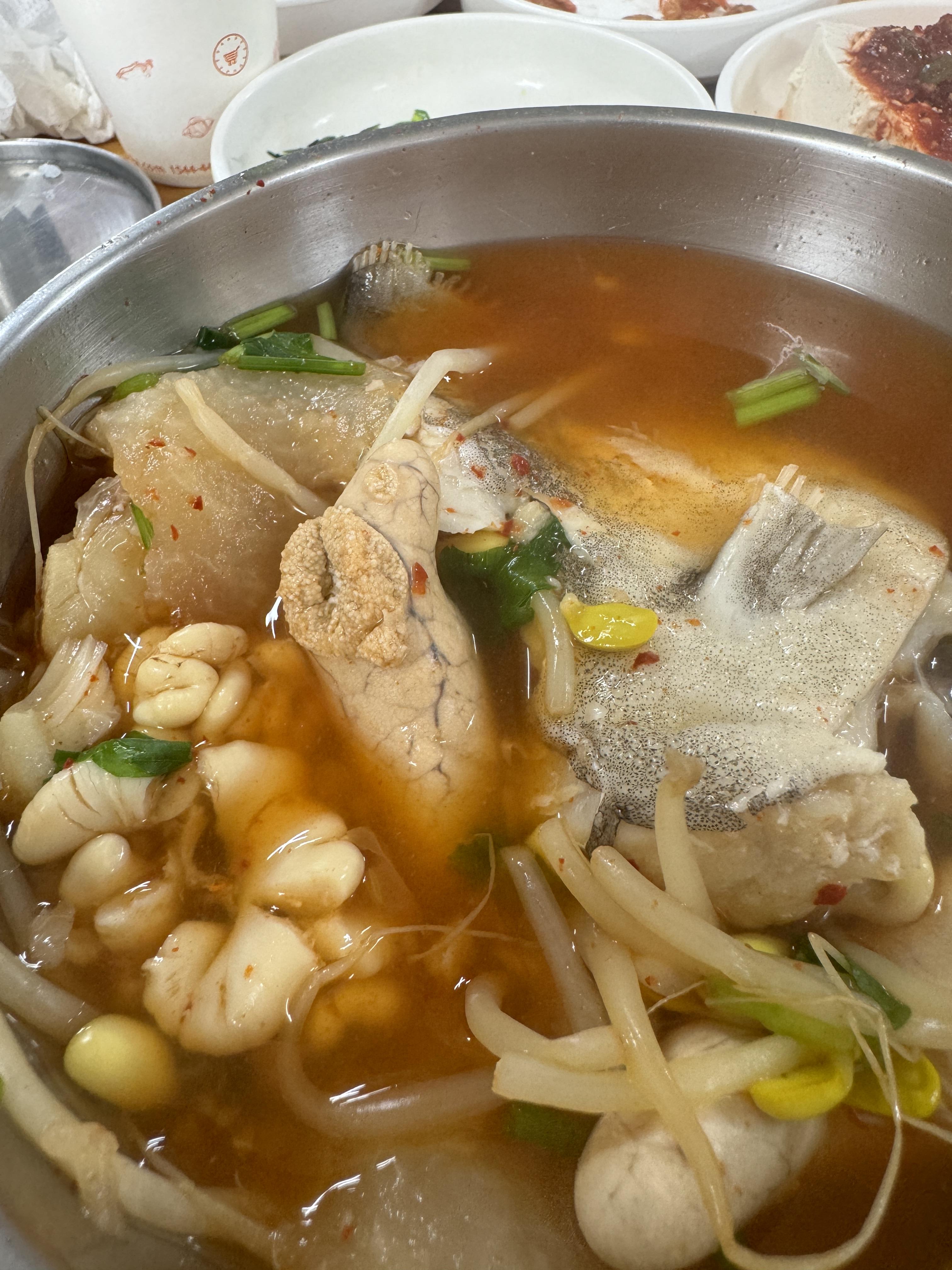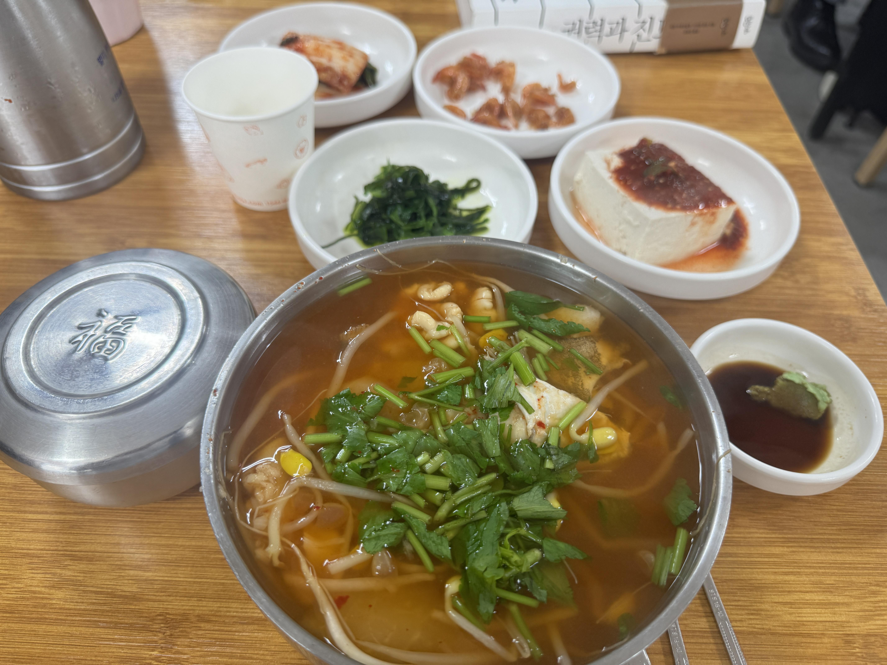 주문하자마자 바로 음식이 나온다. 정말 패스트푸드다 ^^ 그냥 맛만보면 고추가루탄 국물에 대구, 알, 곤, 콩나물을 넣어 끓이고 마지막에 미나리를 얹어준다.