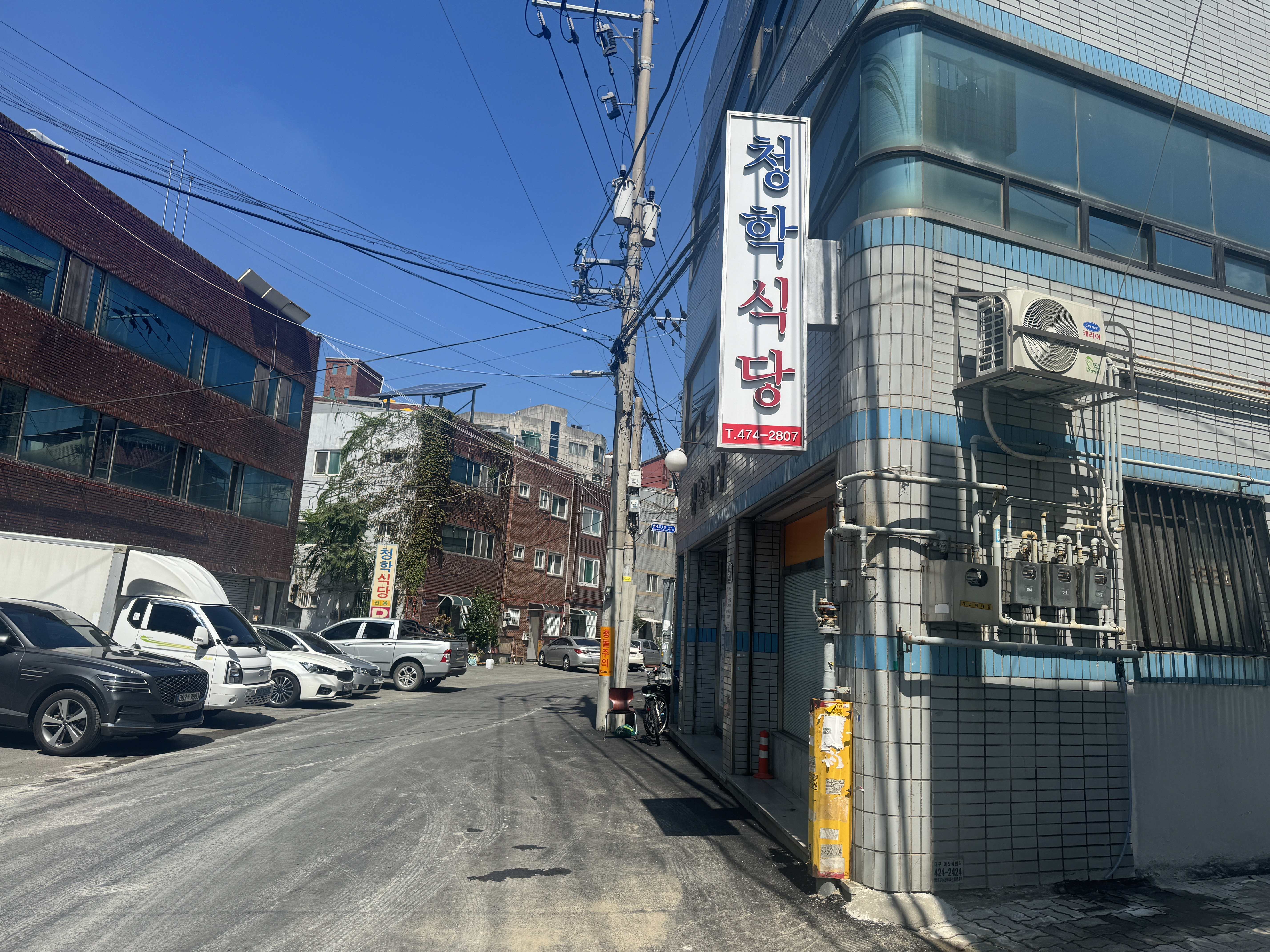 접촉사고후 자동차 수리를 위해 오랜만에 대구 남구 영대병원역 근처를 들렀다 점심시간이 되어 지도에서 혼자서 먹을만한 메뉴를 검색하다 청학식당을 찾았다. 위치는 영대병원역과 대구교대역 중간 즘에 있고, 더 정확하게는 대구고등학교 건너편 골목에 있다.