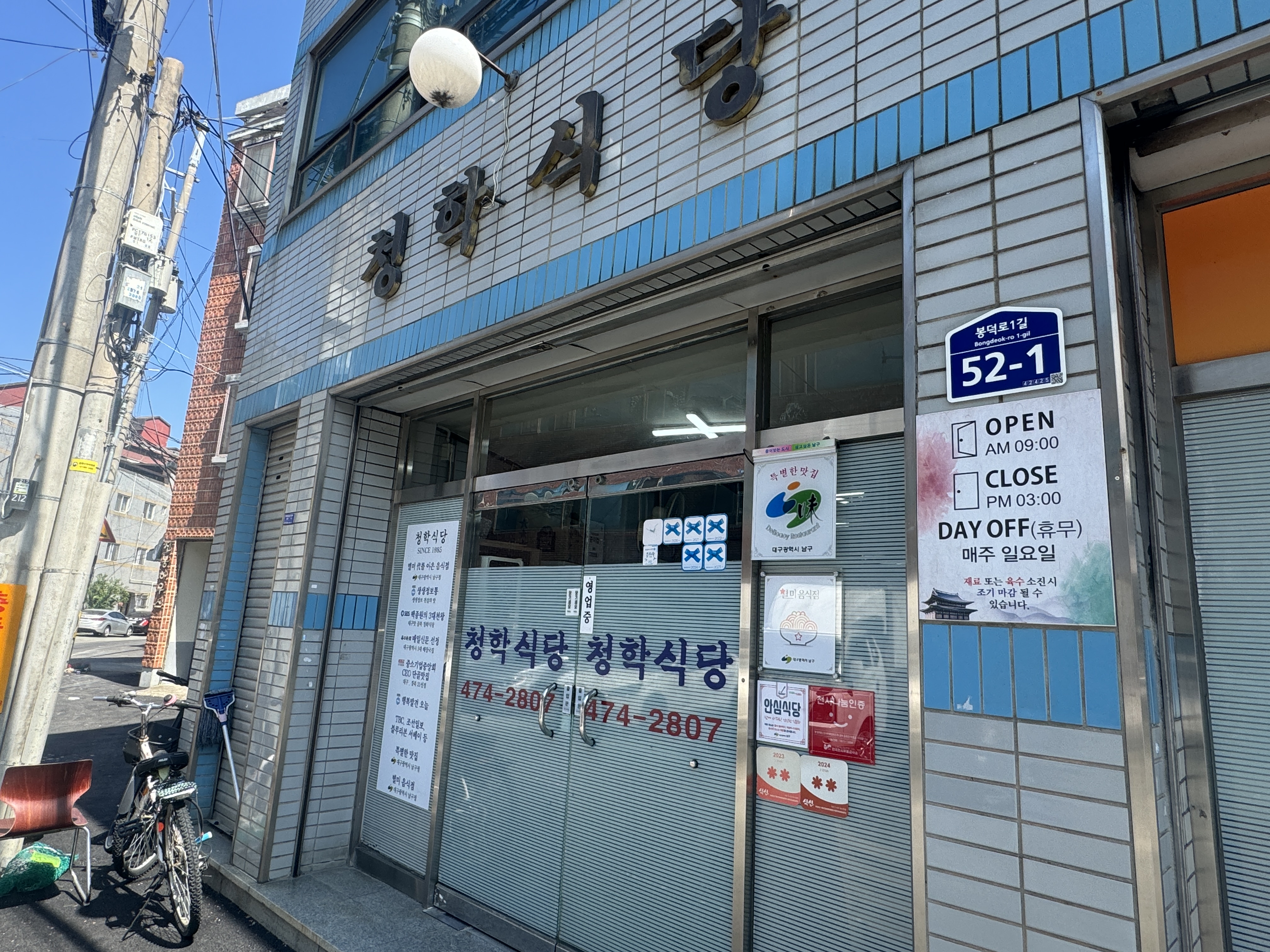 골목 안 쪽을 들어가니 파란색 타일의 건물에 청학식당 간판이 보인다. 저 멀리서는 청학식당 전용 주차장 간판도 쉽게 보여서 찾기 어렵지 않았다.
