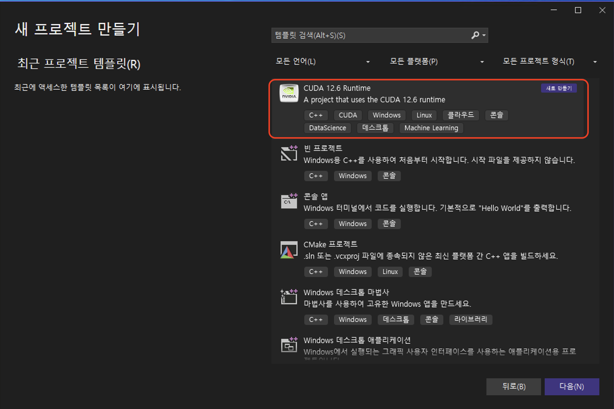 - 새로운 프로젝트 생성 템플릿에 CUDA 항목이 추가됨