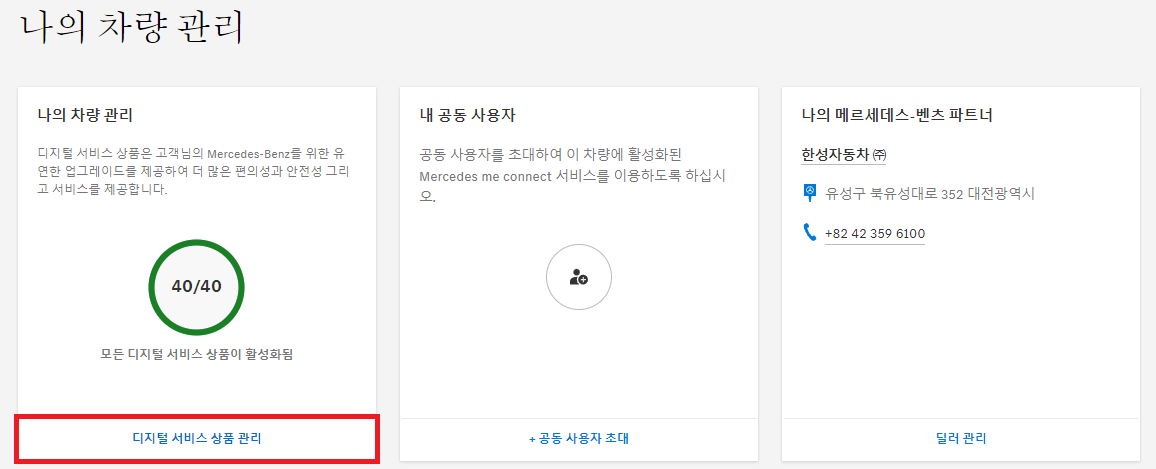 - 웹페이지 오른쪽 상단 사용자 이름 클릭 - 내 차량 관리 - 디자털 서비스 상품 관리 클릭