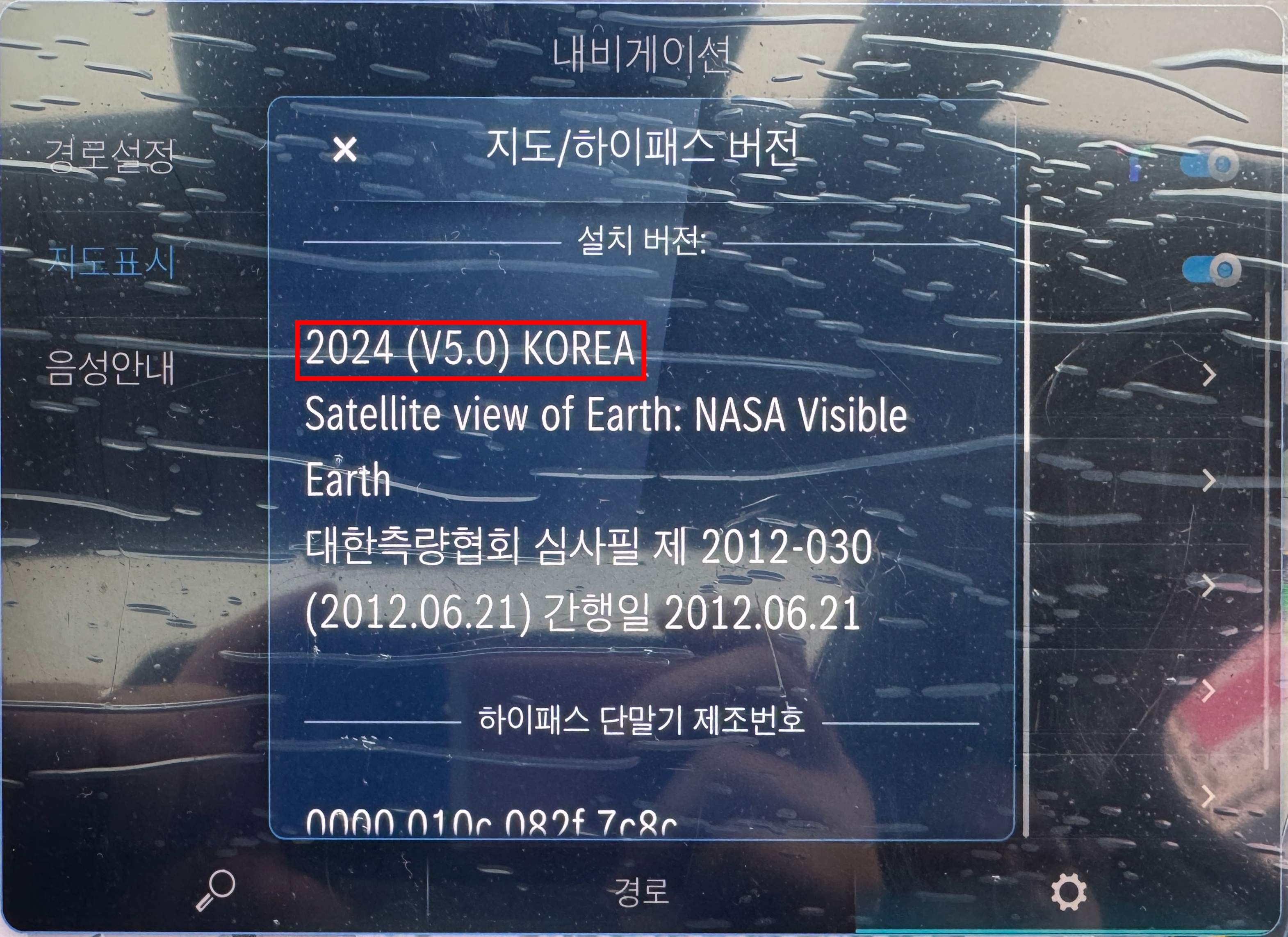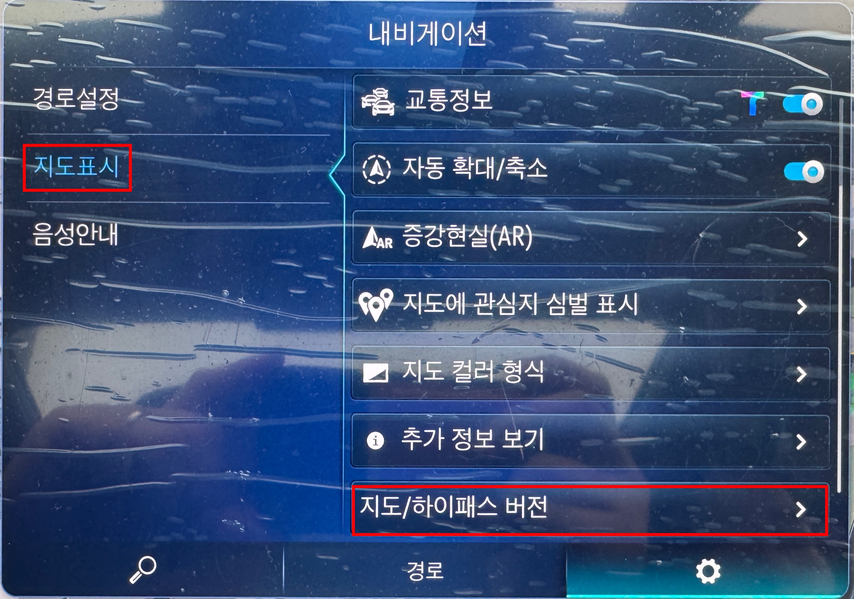 네비게이션 실행 - 왼쪽 상단 자동차 그림 선택 - 새창의 오른쪽 하단 '설정' 버튼 선택 - 지도표시 탭 - 지도/하이패스 버전