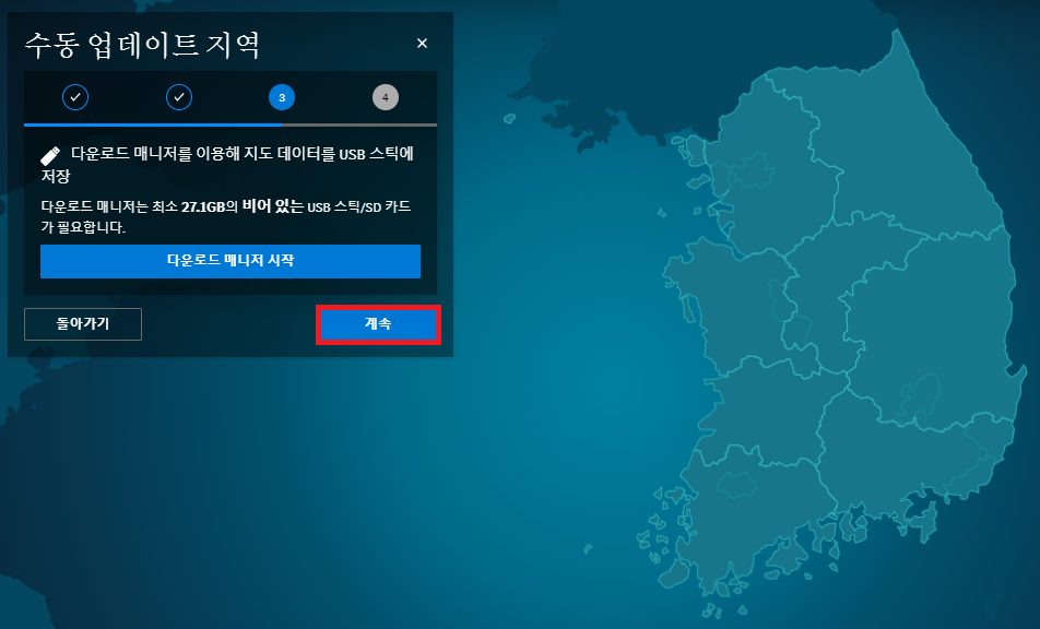 - 수동 업데이트 지역 선택 - 특정 지역에서만 운행하면 해당 지역만 선택해도 되지만 대게는 전체지도 선택