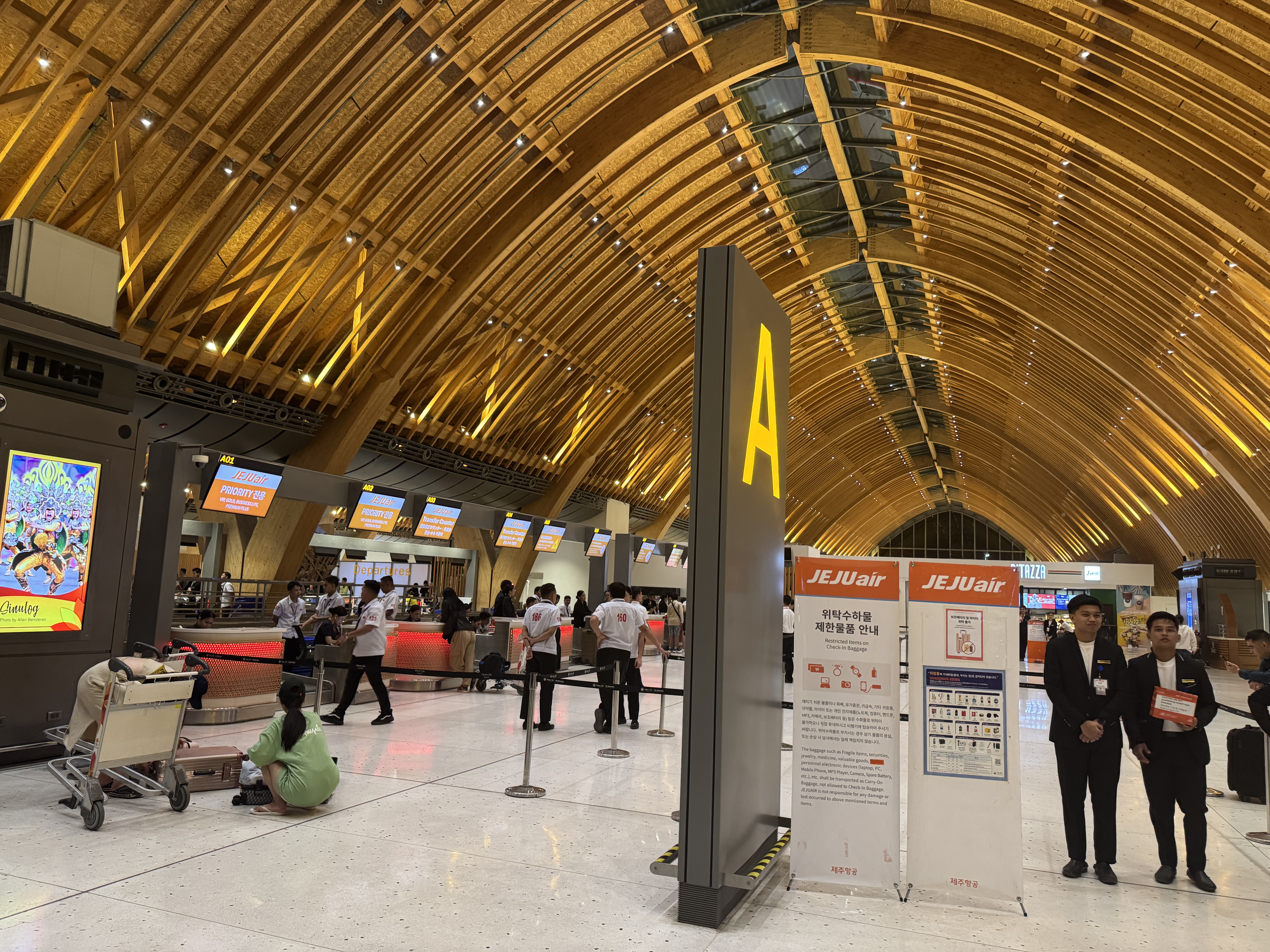 다른 공항들과는 달리 특이하게 2층 출국장 안으로 들어가기 위해서는 여권과 e-Ticket (여정계획서)을 보여줘야 한다. A카운터에서 제주항공 체크인과 위탁수화물을 맡길 수있었다.