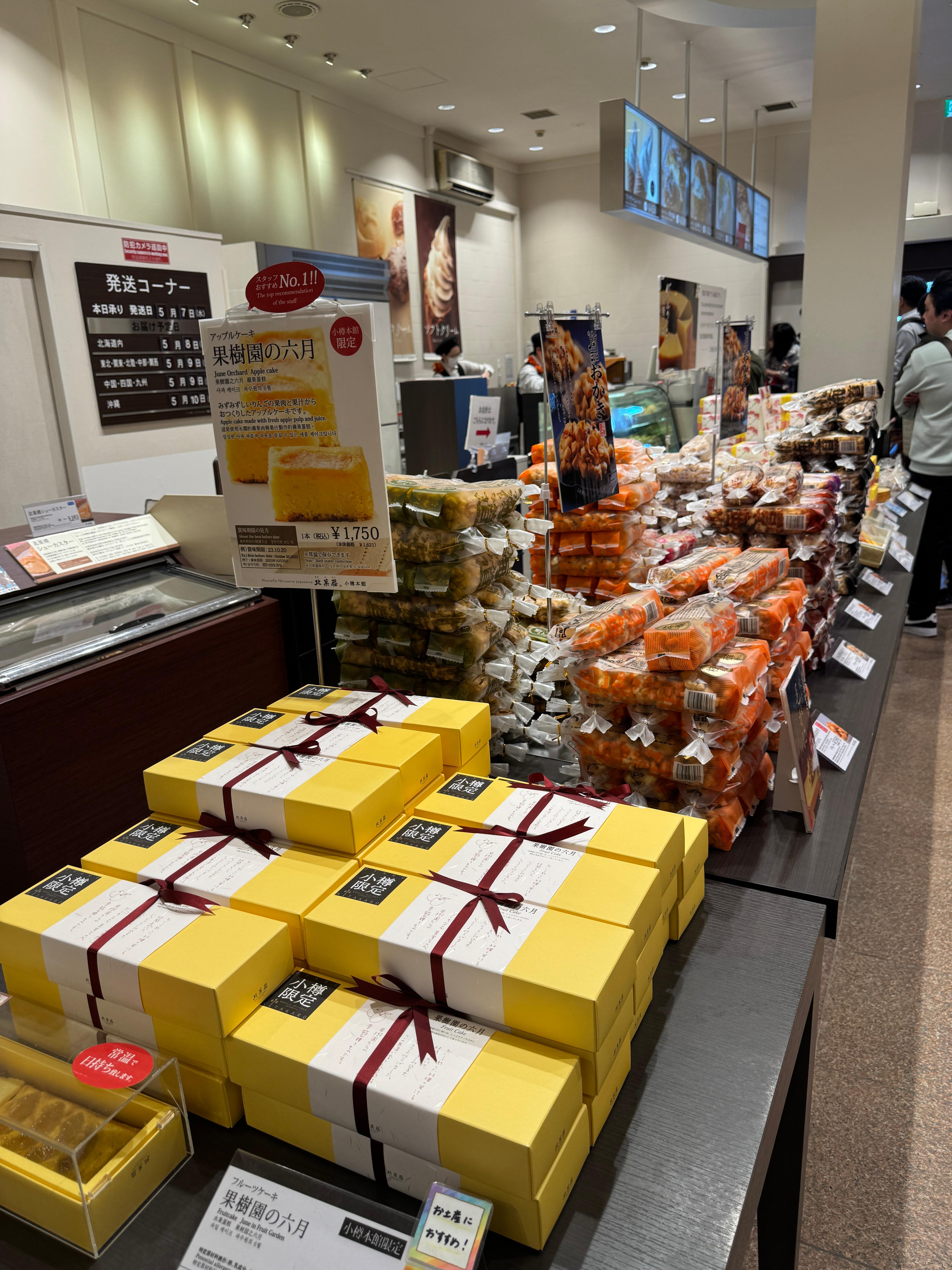 아래 사진의 과자들이 유명한 듯하다. 다들 면세가 되는 가격만큼 사서 주문하기에 바빠 시장통 같았다. 대표상품이 바훔쿠헨이고 쌀과자 카이타쿠 오카키도 많이 팔린다고 한다.