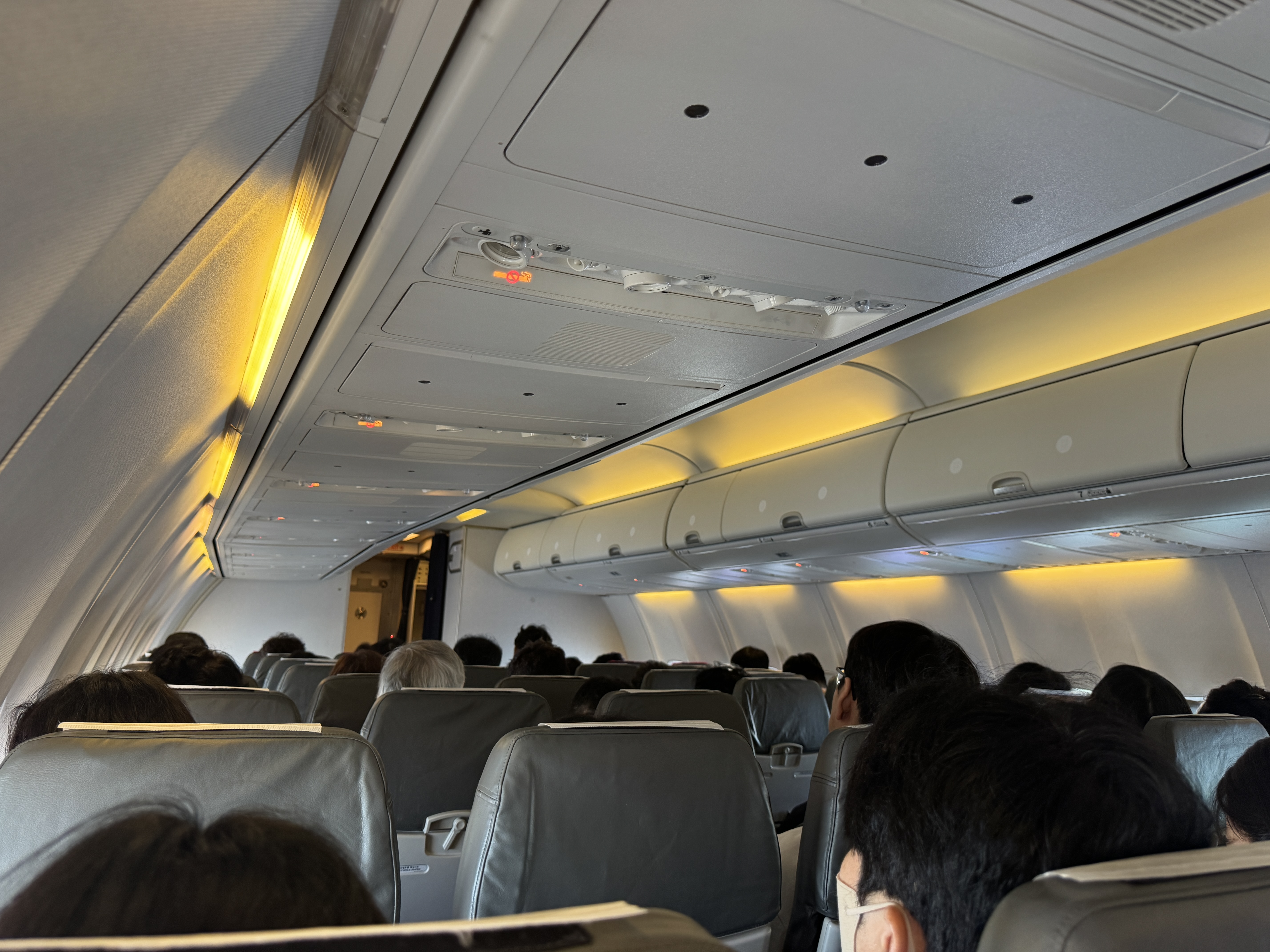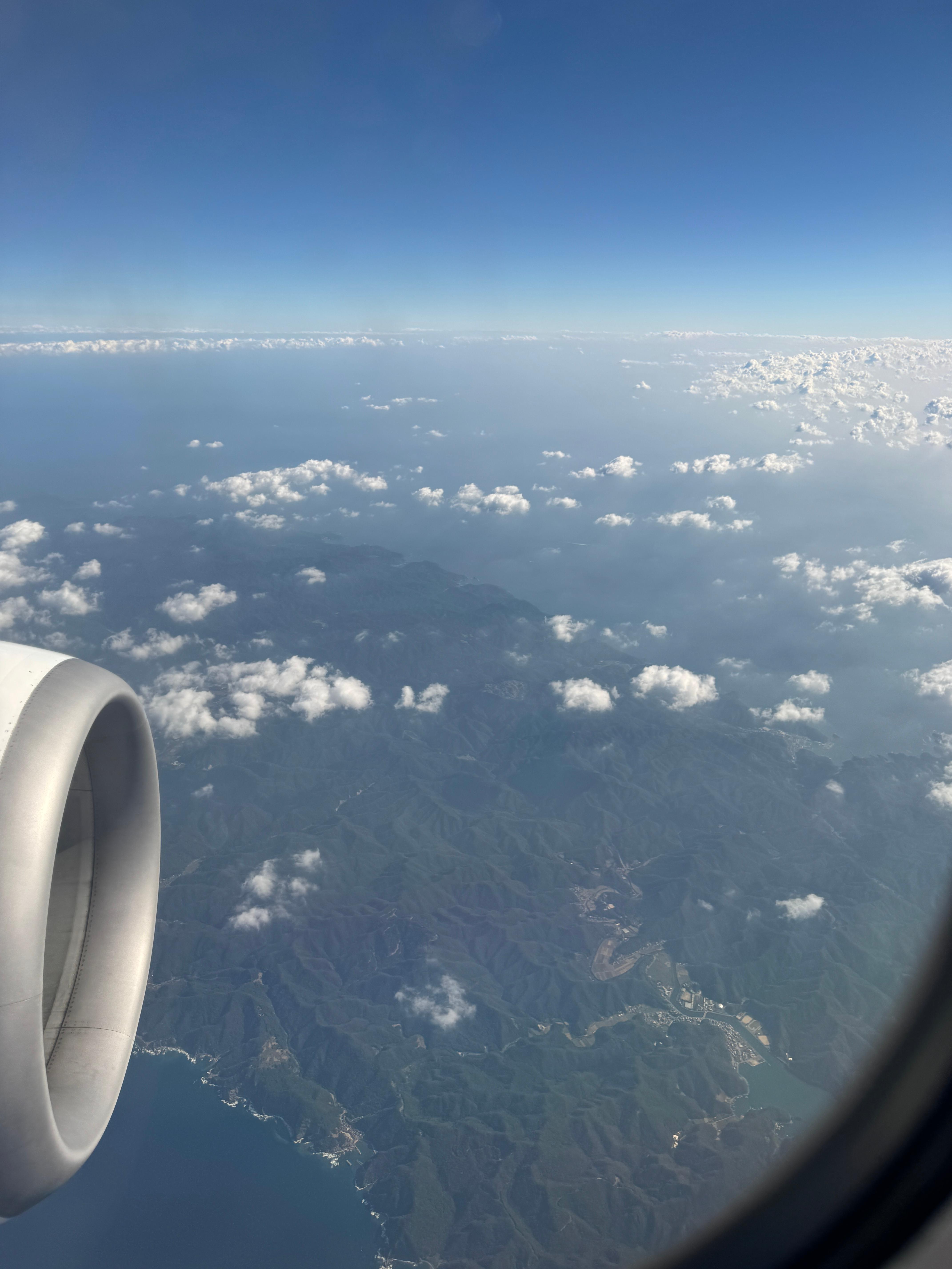 9:40 정도부터 탑승을 시작해서 금방 전부 탑승했다. 월요일 비행이라도 거의 만석이었던 듯하다. 1시간의 짧은 비행이라 창측 좌석에 앉았다. 좌석간격이 좁긴해도 제주도 가는 것과 별반 차이가 없어 불편한 점은 없었다.