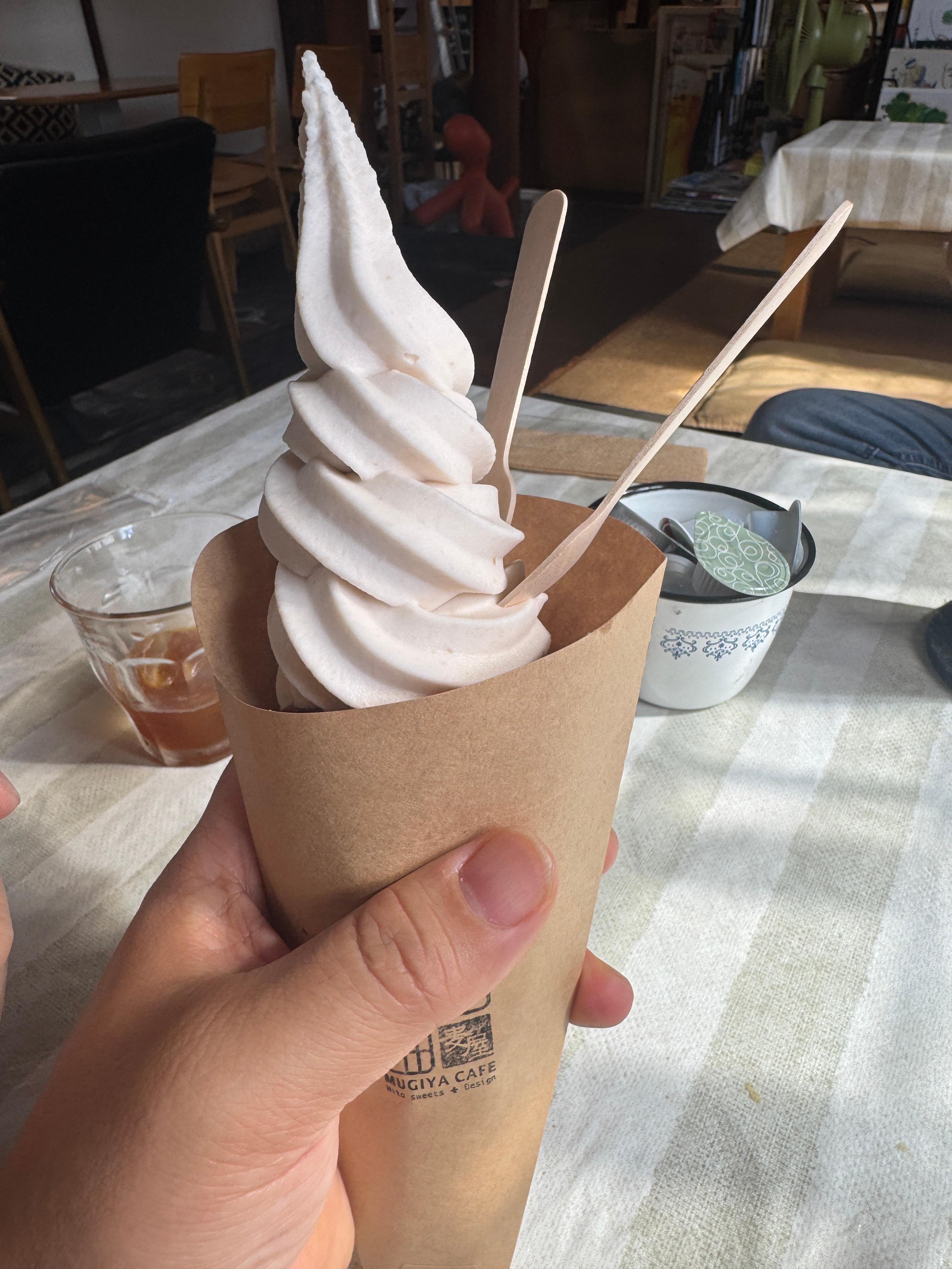 아이스크림이 올라간 소라모양 빵이 유명하다고 해서 아이스크림도 하나씩 주문했다. 우유 소프트아이스크림도 있고, 배 맛의 아이스크림도 있다. 배 맛 아이스크림은 처음인데, 히타 지역이 배가 특산품중 하나라고 한다.