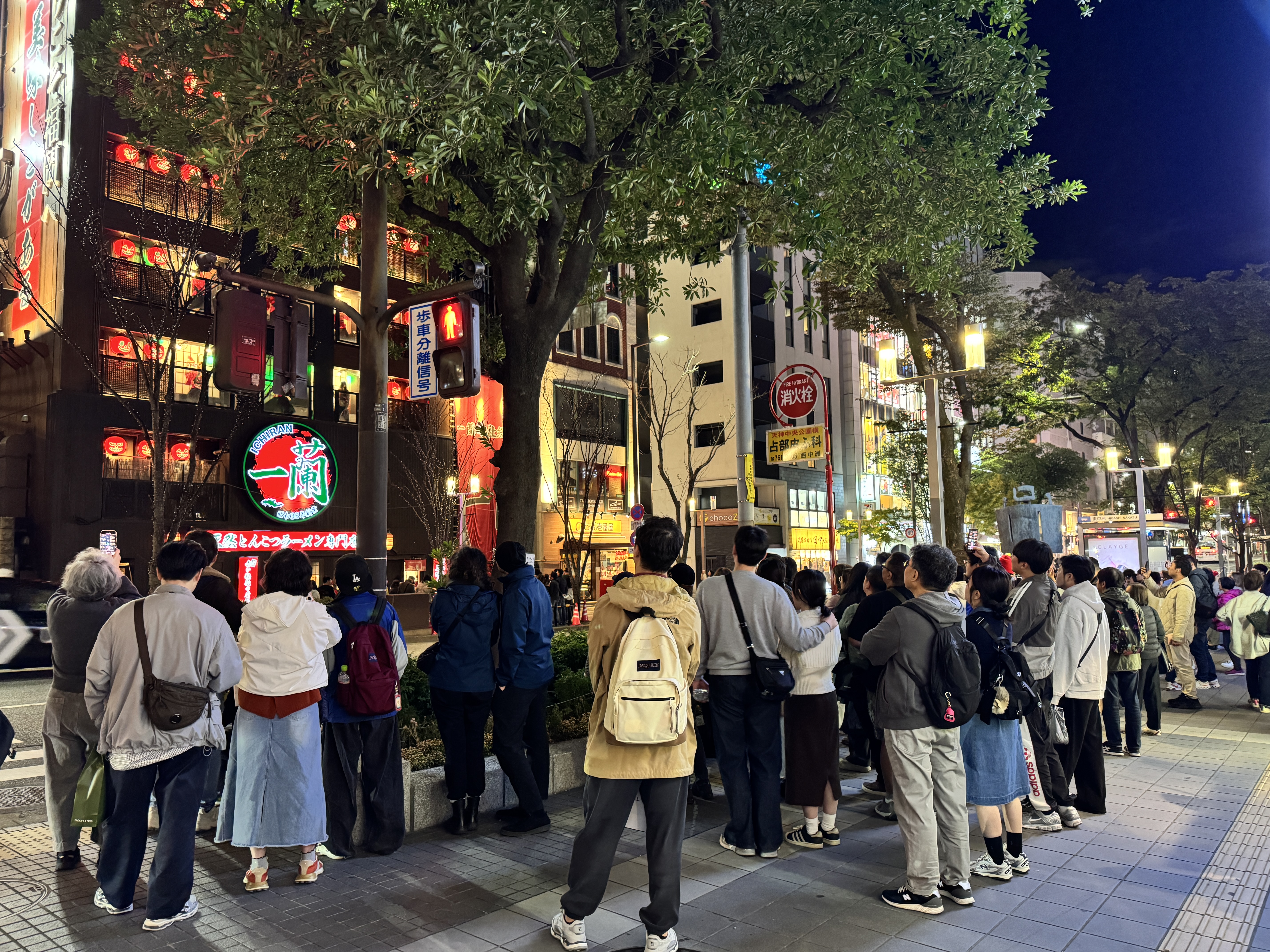 웨이팅 줄이있어도 20~30분 정도라고 하는데 웨이팅은 딱 질색이라 오며가며 사진만 찍었다. 이치란 본사총본점의 경우 저녁 8시마다 가게 베란다에서 공연을 한다. 건물 맞은편에 많은 사람들이 영상을 찍고 있는데, 공연 수준이 뭐 그닥... 이걸 봐야하나 싶을 정도였다.