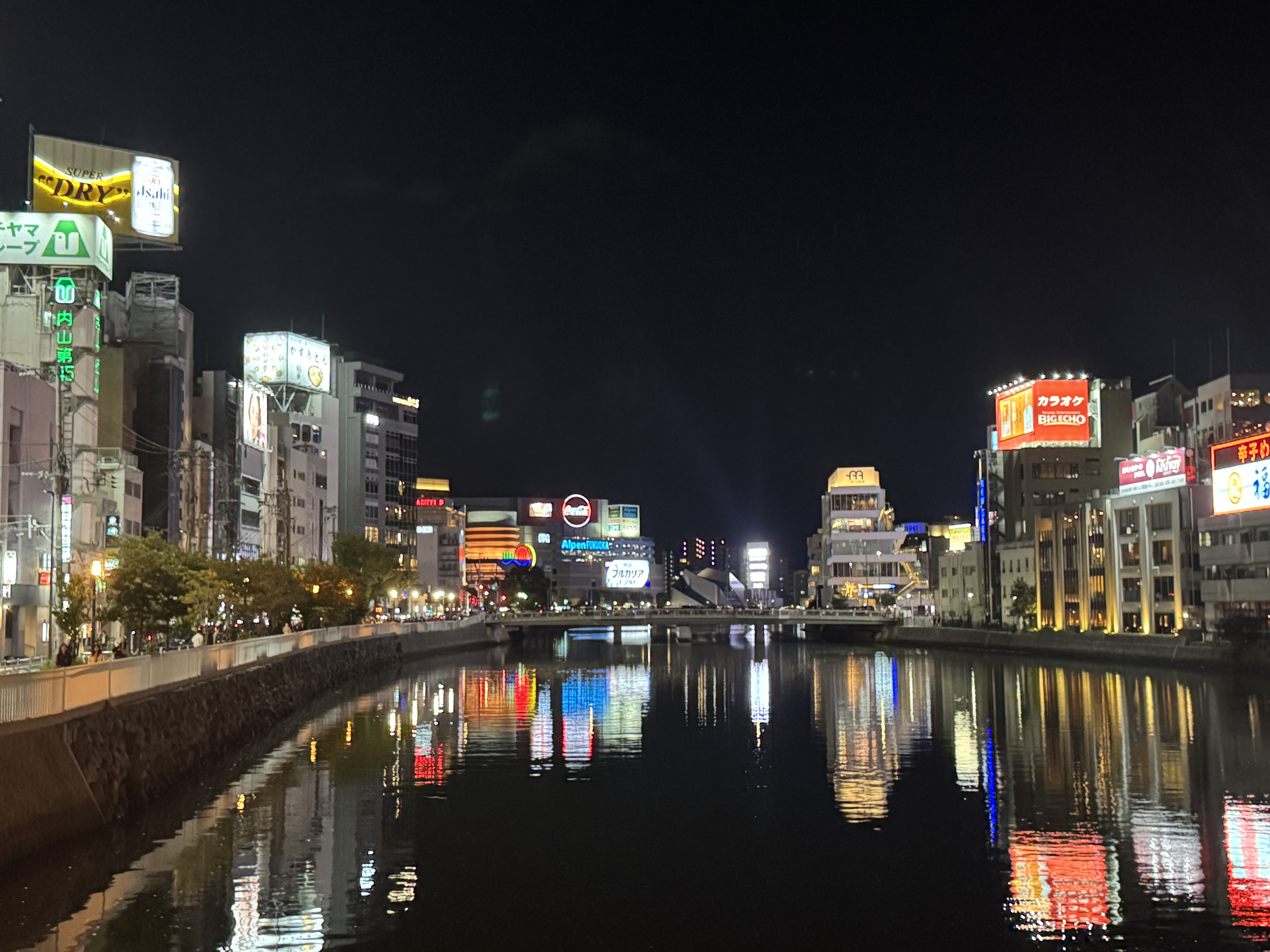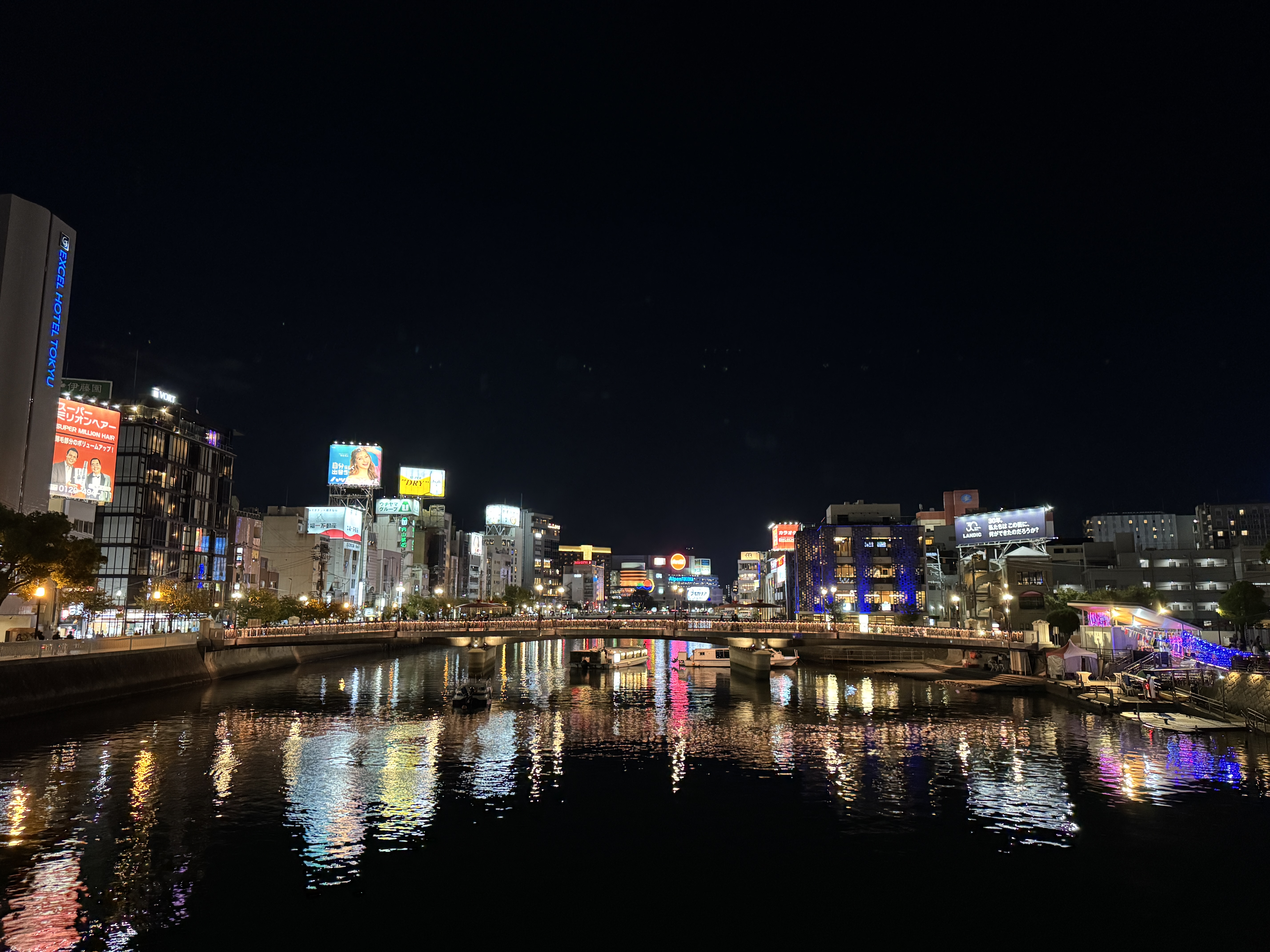 이치란 본사총본점을 지나자마자 나오는 나카강 야경은 꽤 괜찮았다. 후쿠오카만남다리 (또는 코카콜라다리)라는데 밤에는 다리에 조명이 들어와서 더 이쁘다. 저 멀리 캐널시티의 불빛도 보인다.