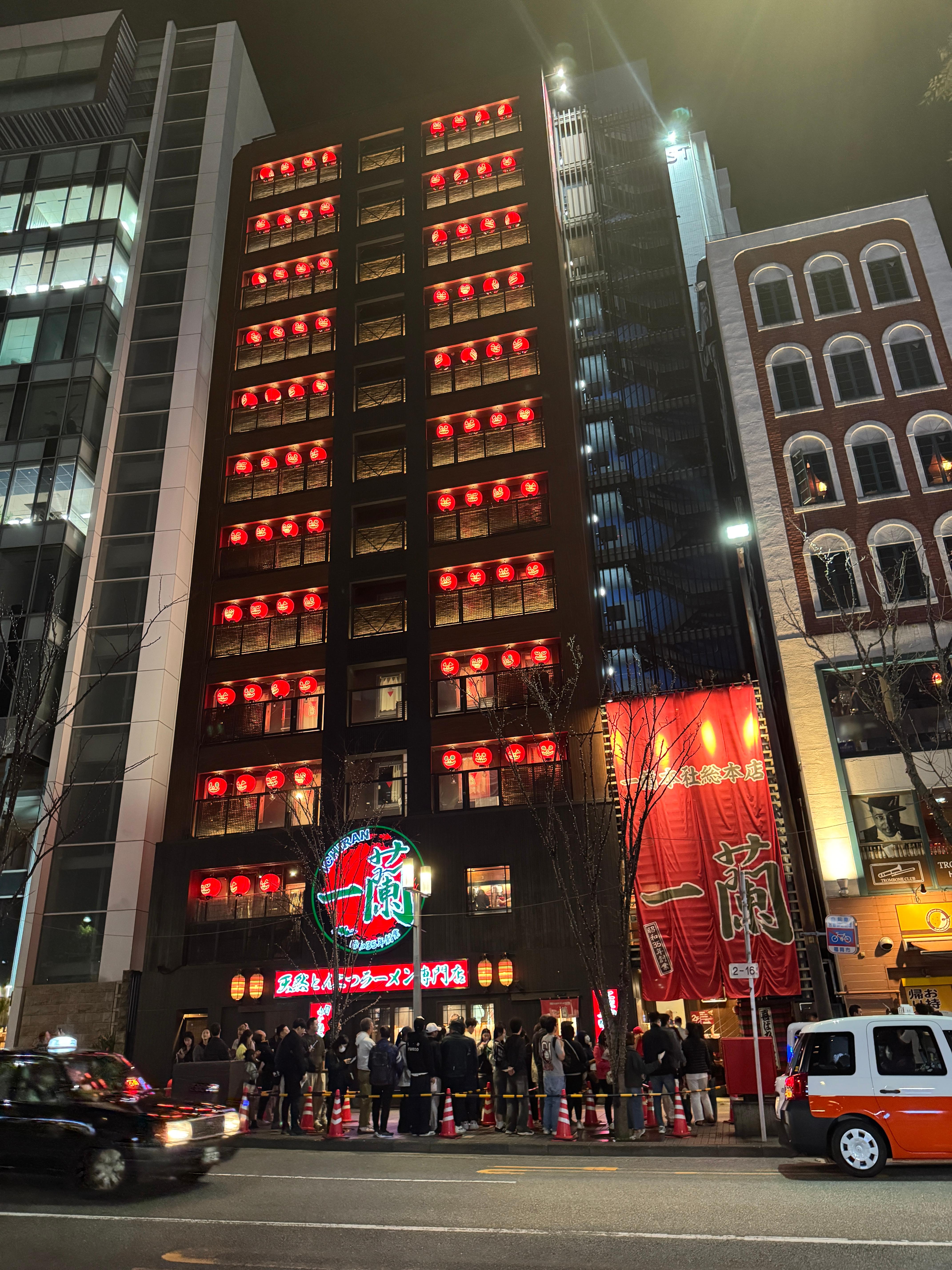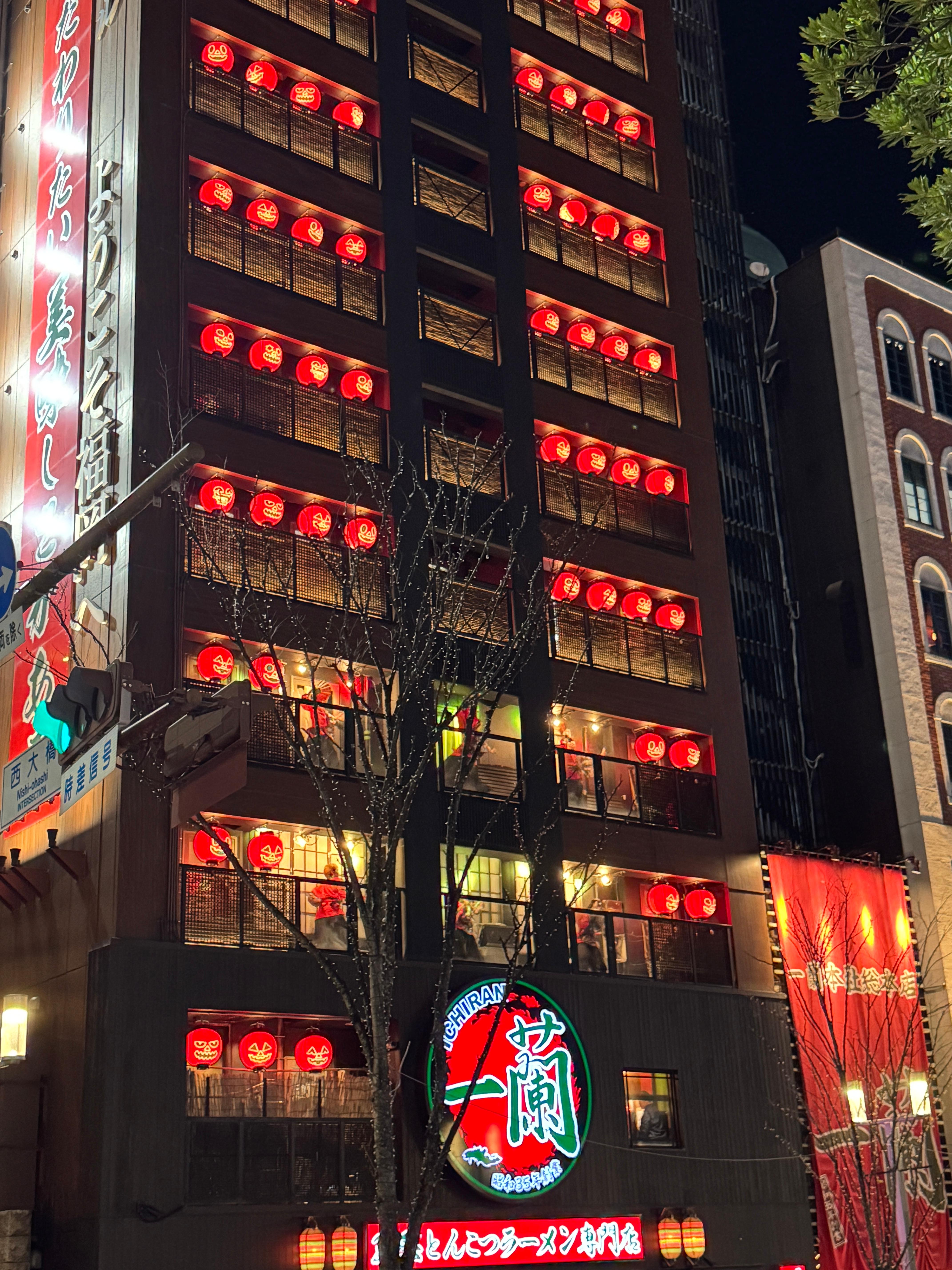 후쿠오카에 이치란 본사총본점이 위치해 있다. 건물전체에 빨간색 등이 있어 지나가다보면 한눈에 딱 뛴다. 게다가 가게 앞에 웨이팅이 항상있다. 24시간 영업하는 곳이라 밤 늦게도 항상 웨이팅이 있다.