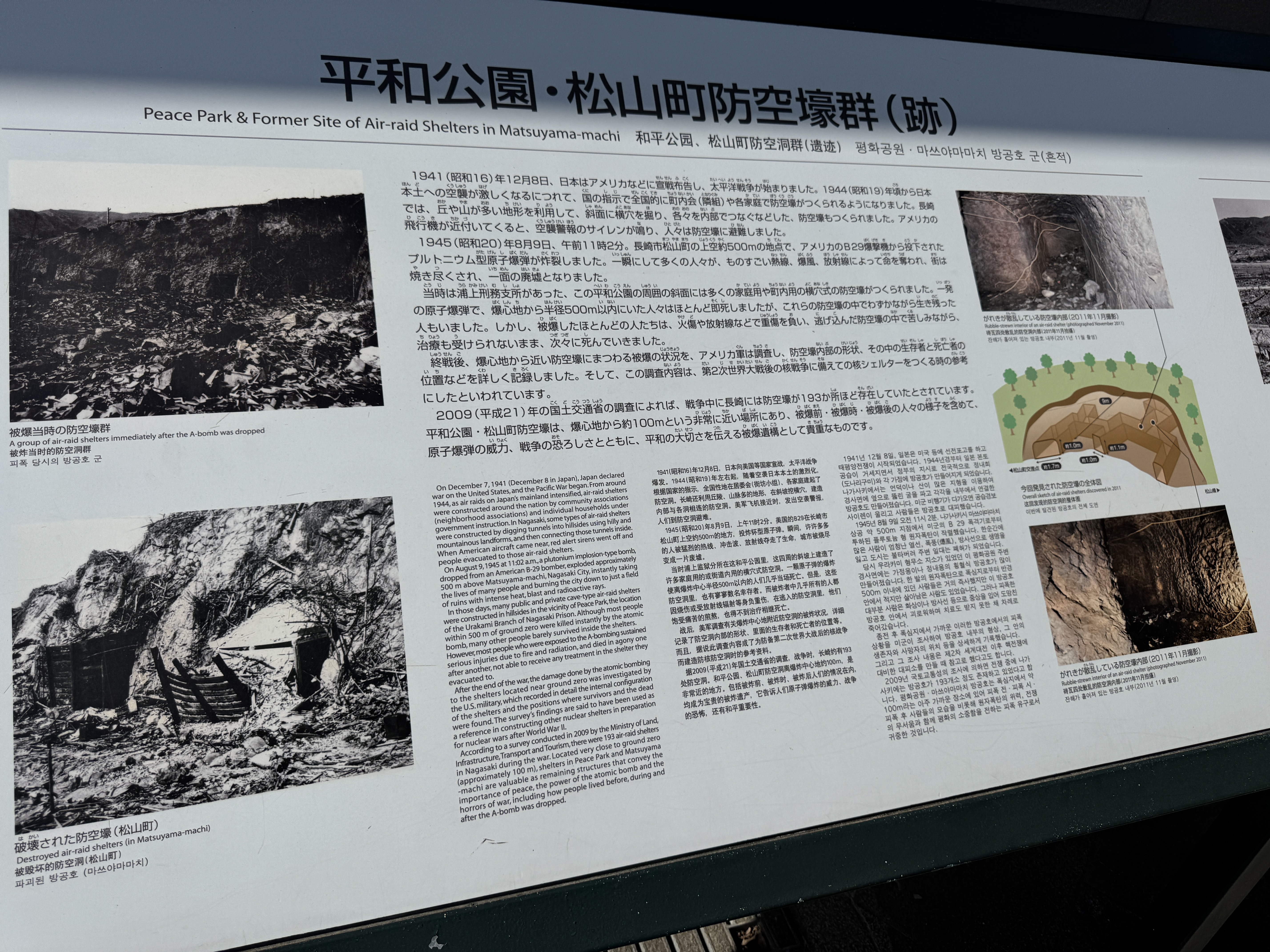 평화공원에서 도로를 건너면 나가사키에 원자폭탄이 떨어진 곳에 조성된 폭심지 공원이 있다. 공원입구의 알림판 내용을 보면 제 1공격 목표는 고쿠라시였지만 날씨가 좋지 않아 제2목표인 나가사키에 원자폭탄이 떨어졌다고 설명하고 있었다.
