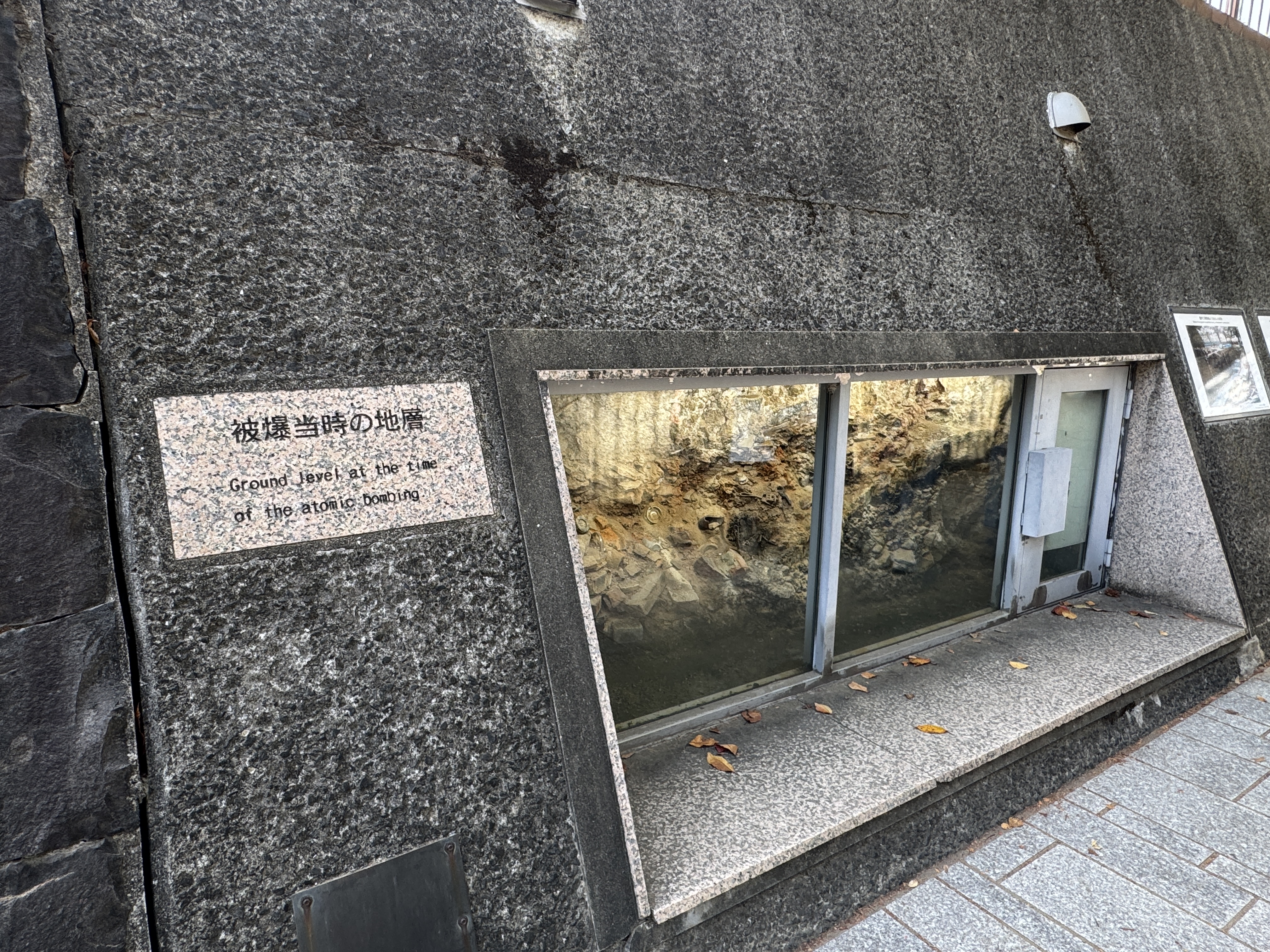 표지판 밑에 가보니 피폭 당시 지층이라는 소개와 함께 원폭 낙하 중심지에는 원폭으로 부서진 기와나 벽돌 등이 매물되어 이를 보여주고 있었다.
