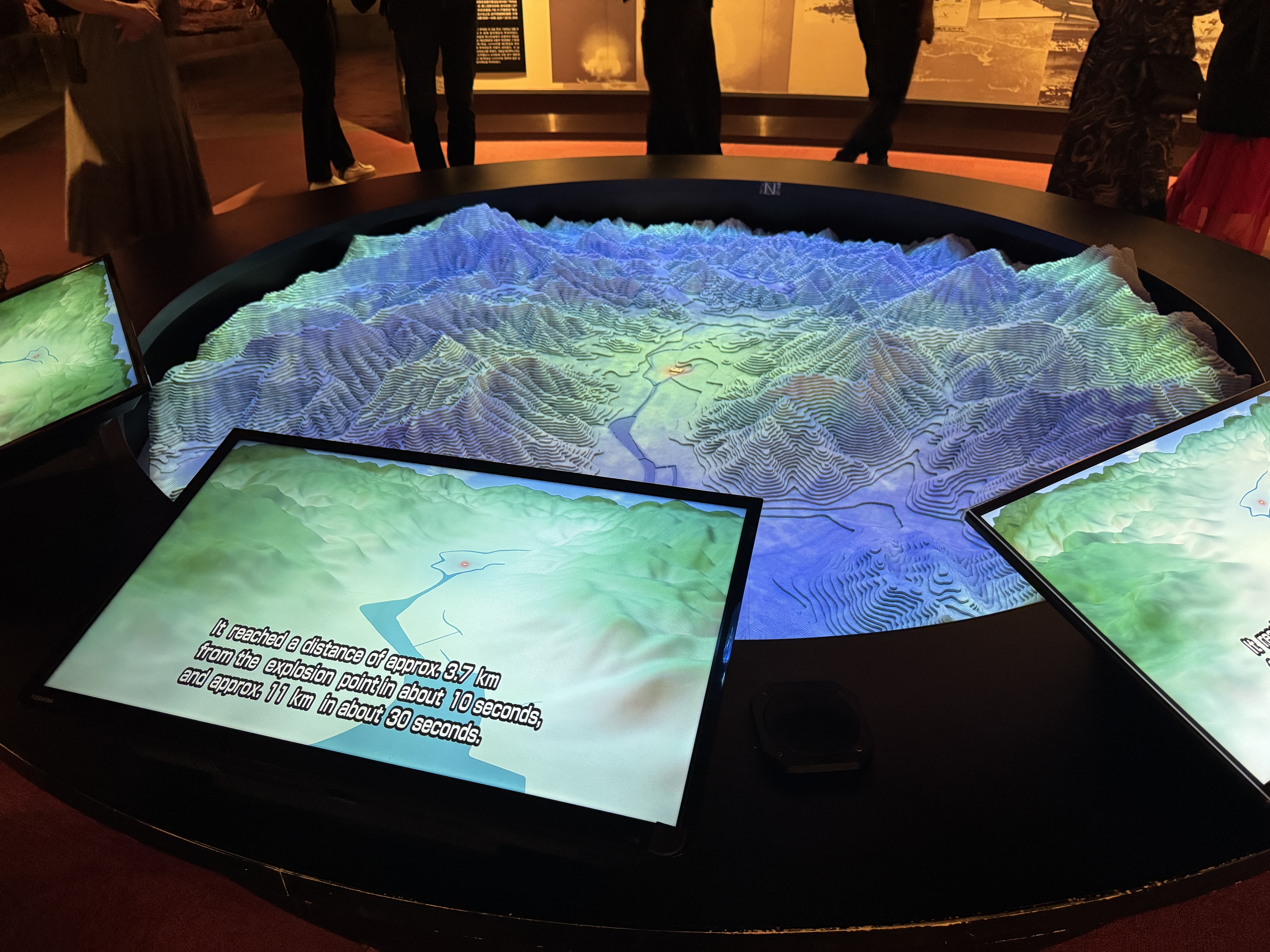 지형모형에서 시간에 따른 원폭에 의한 영향을 영상으로 보여주고 있다.