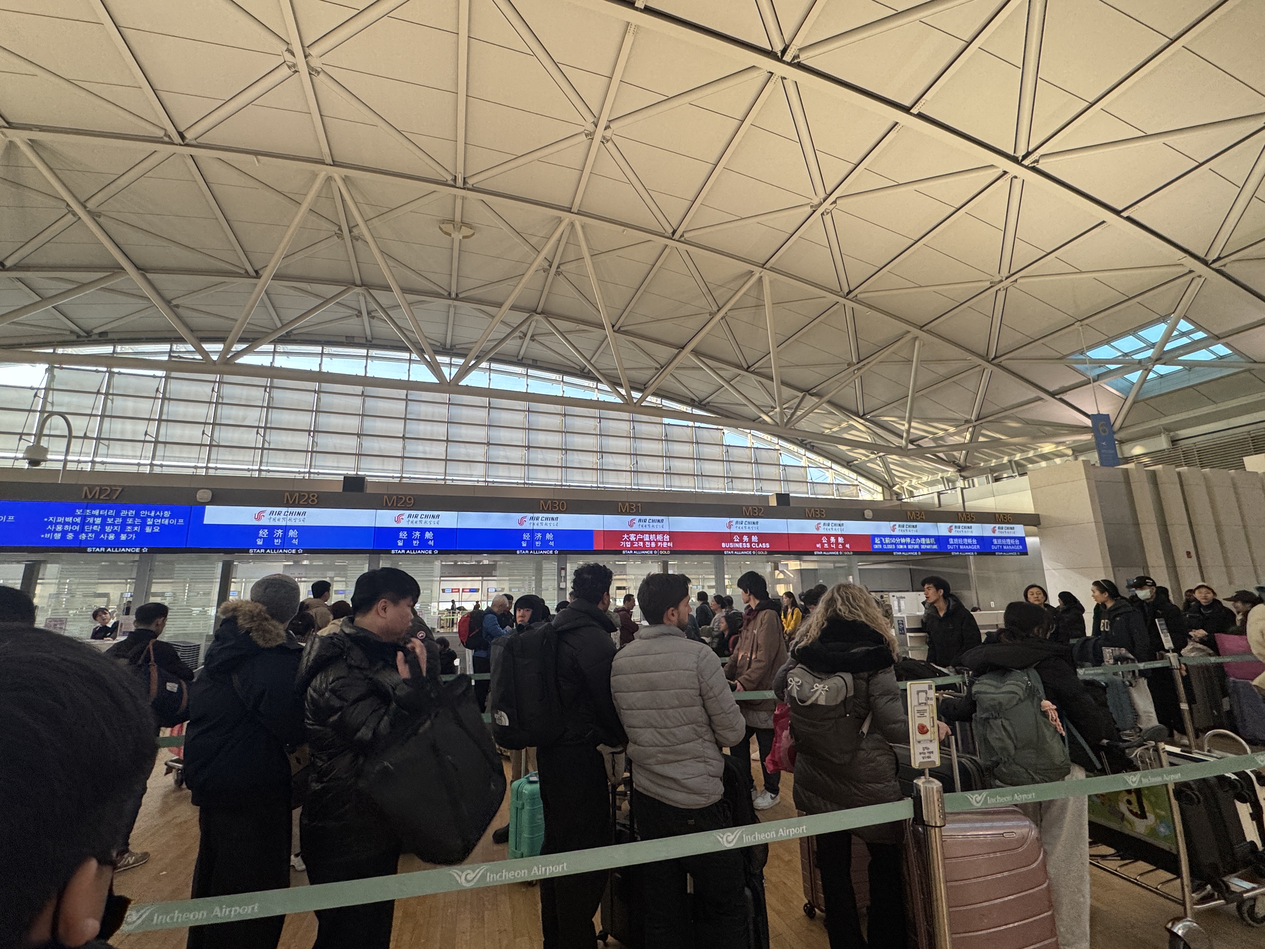 2년 전 즘 스톡홀름을 갈 때와 달리 이번에는 KTX로 광명역을 경유해서 공항리무진으로 인천공항에 올라갔다. KTX002 열차가 광명역에 7:33에 도착하여 7:50에 광명역에서 출발하는 리무진버스를 모두 코레일앱으로 예약이 가능하다. 이런 루트로 인천공항T1에 오전 8:30경에 도착할 수 있었다. 에어차이나 카운터는 인천공항 T1 입구에서 가장 왼쪽편에 위치한 M27-M36에서 한다. 옆의 말레이시아항공에 비해 줄이 생각보다 짧아서 크게 오래걸리지는 않았다. 아시아나 대한항공 합병건 때문에 그런지 에어차이나 카운터에 대한항공 직원들이 체크인업무를 하고 있었다.