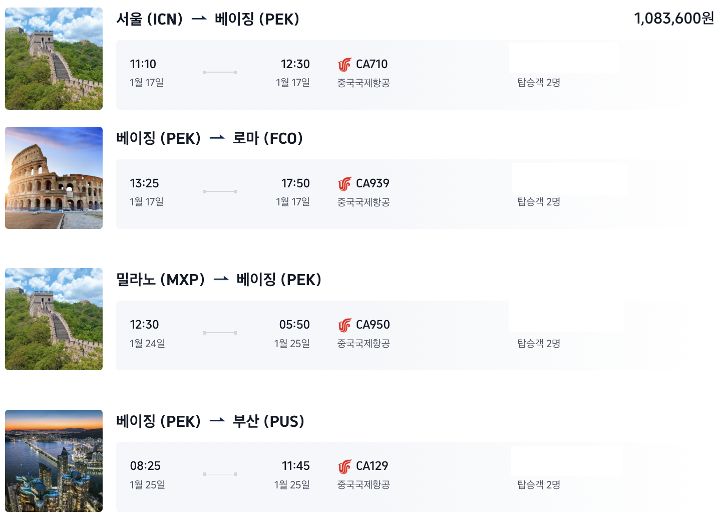 1월 유럽여행을 위해 여러가지 비행편을 검색하다 결국 말도안되는 가격으로 유럽을 왕복할 수 있는 에어차이나 항공사로 비행편을 예약했다. 인천 → 베이징 → 로마 ... 밀라노 → 베이징 → 김해 로 오는 비행편으로 1인당 왕복 54만원의 가격으로 예약했다. 재미있는 점은 왕복이 54만원이면 편도는 얼마나 사질지 보니 편도금액과 왕복금액이 기억에는 1만원 내외 정도 밖에 차이가 없어 굳이 편도로 예약할 필요가 없었다