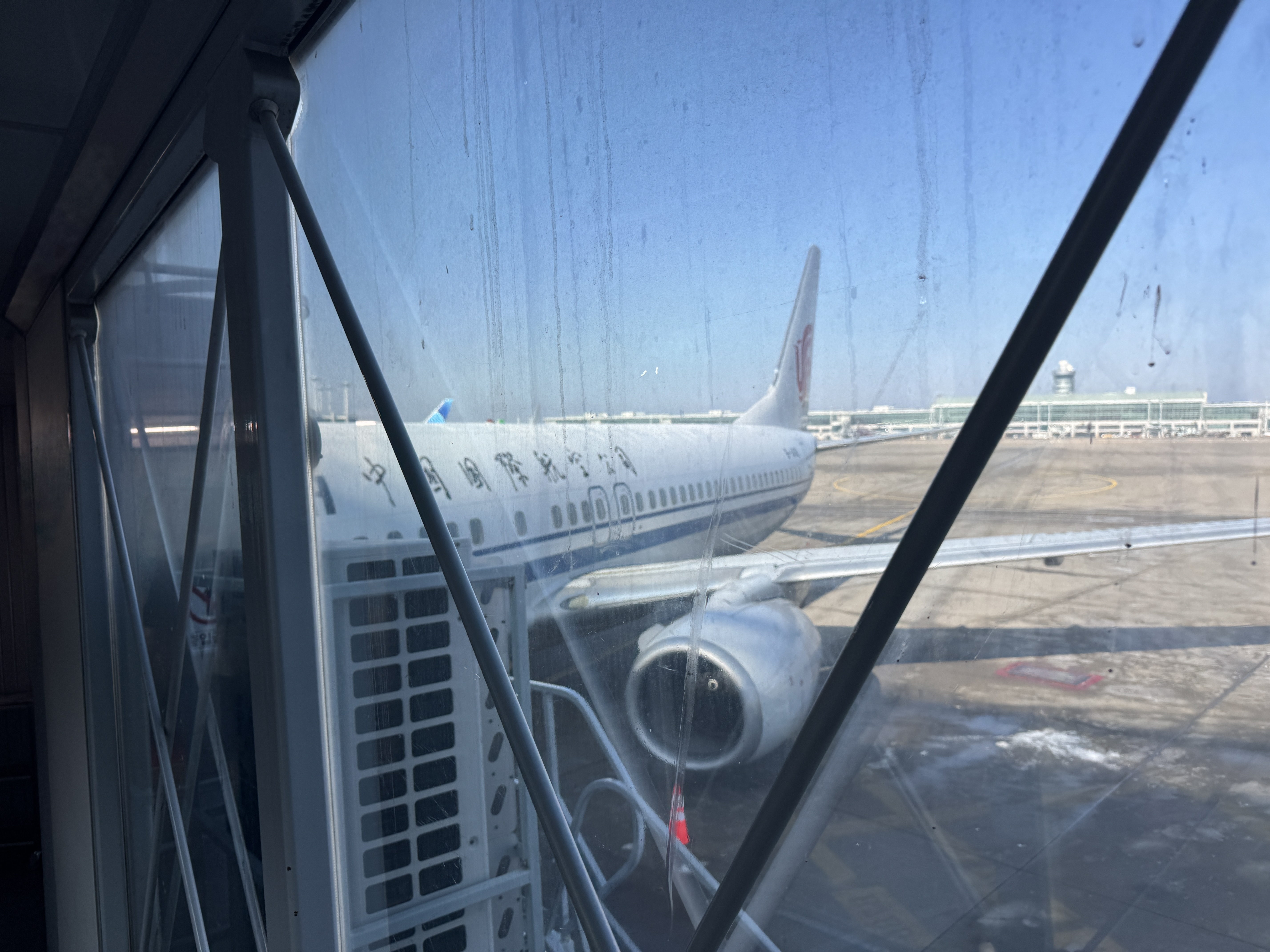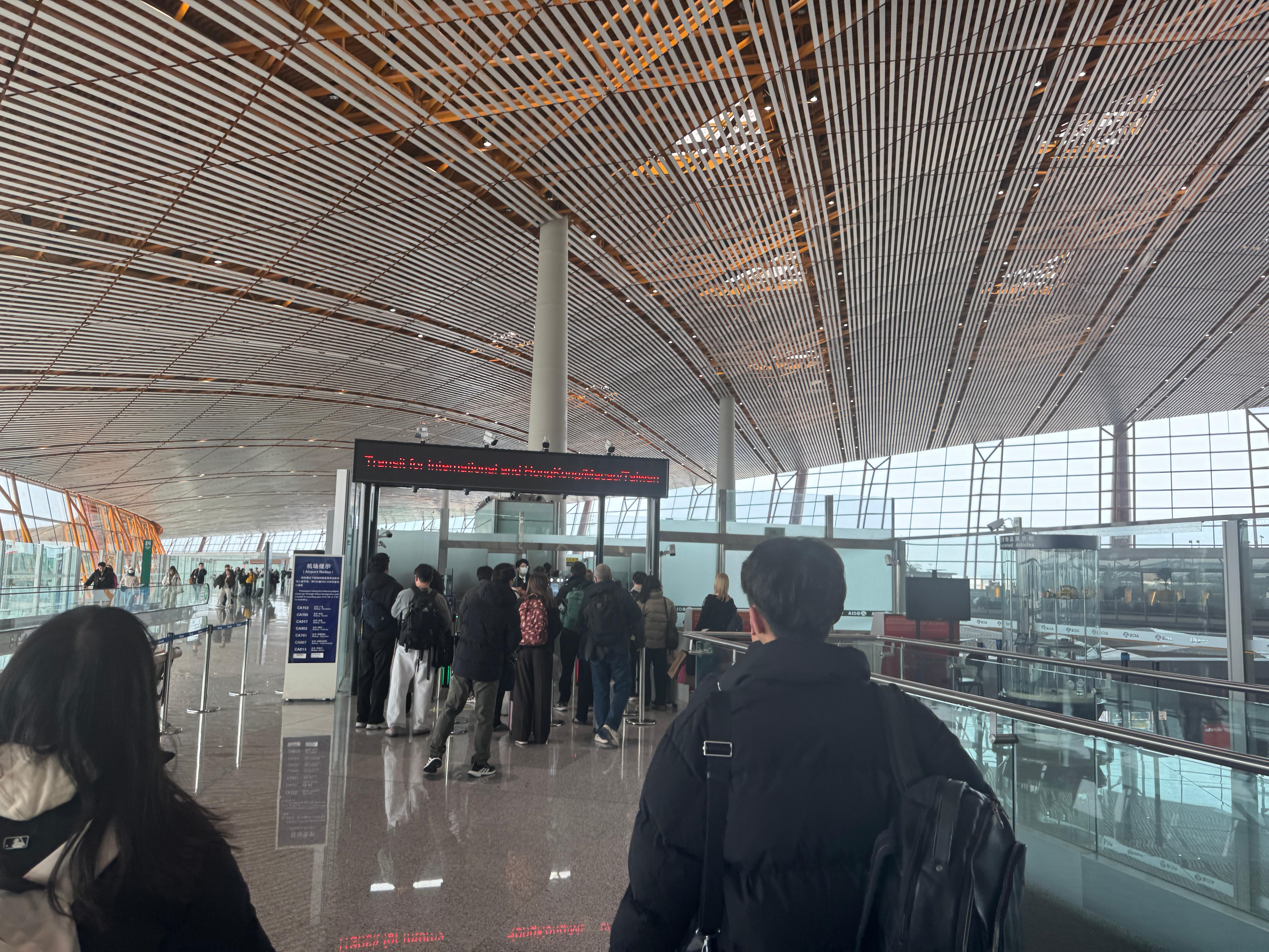 55분의 짧은 환승시간이라 비행기가 늦게 베이징에 도착할까바 걱정이었지만 다행히 12:30 즘에 딱 맞게 도착했다. 비행기 내리자마자 최대한 빨리 빠른 걸음으로 환승을 위해 이동했다. "Transfer to International and HongKong/Macao/Taiwan"이라 적힌 전광판으로 줄을 서고 다시 짐검사를 실시했다. 환승시간 대부분을 여기서 줄서고 검사하는데 보내게된다.