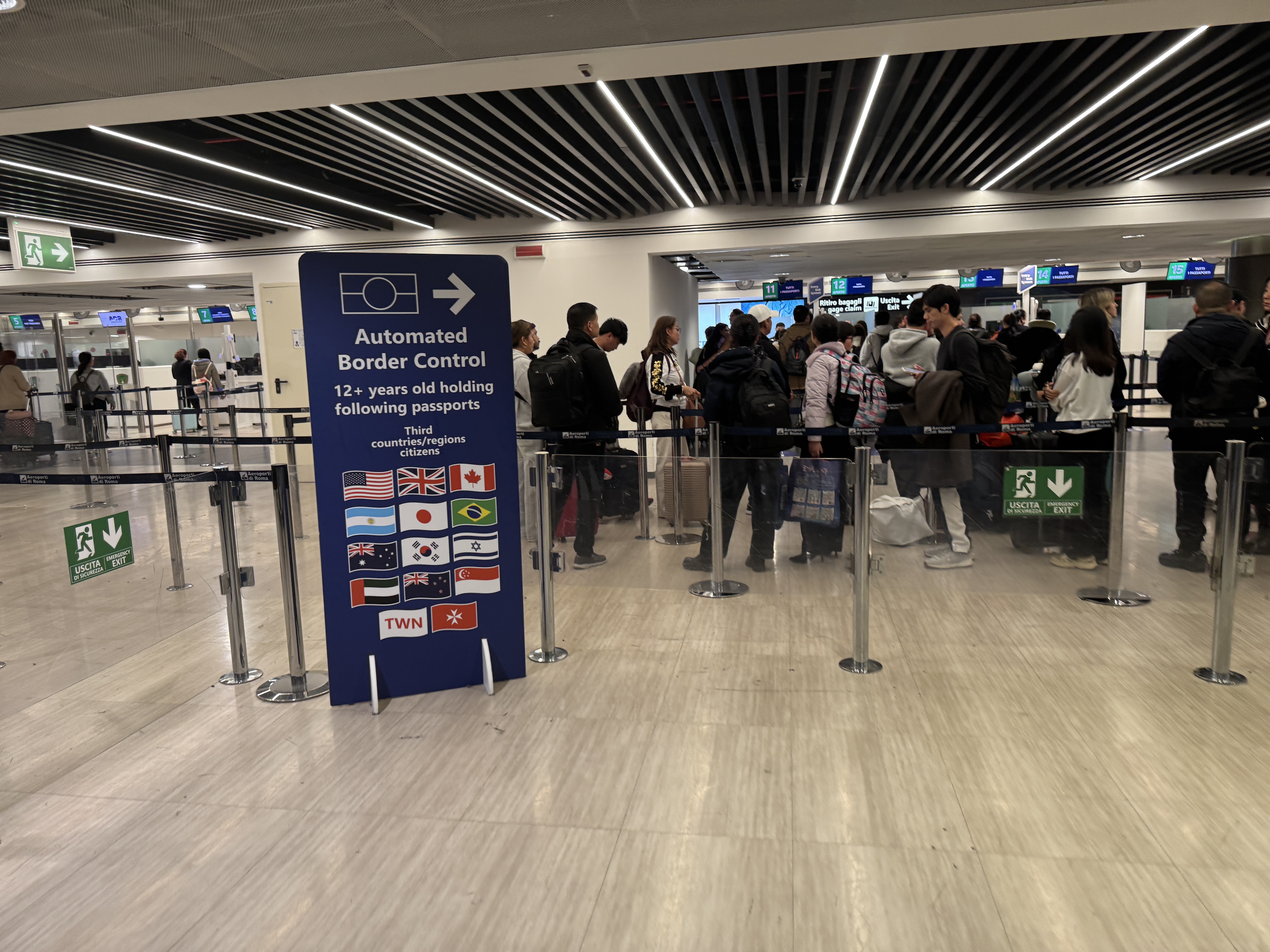 딱 11시간 정도 비행 후 6시 경에 로마 피우미치노 (FCO)공항에 도착했다. 맨 뒷자리에 앉은 대신 비행기에서 내리는데 한참을 걸렸다. 이탈리아 입국을 위해 이동하다 보니 비유럽 시민 (Non-EU Citizens)들의 자동출입국 기계들이 군데군데 제법 많이 있었다. 다만, 운영시간이 06:00-19:00까지라 대부분 닫혀 있었다.