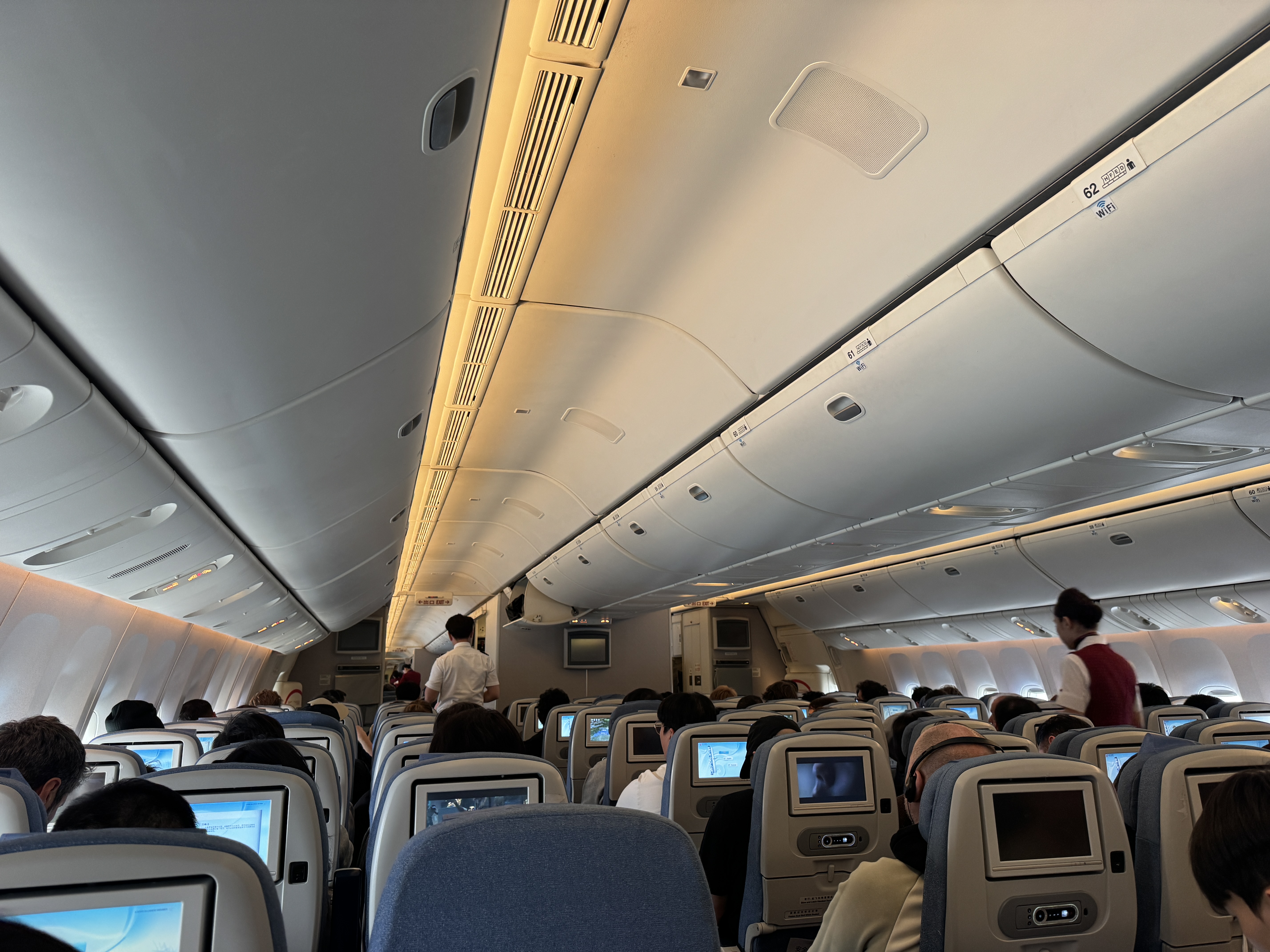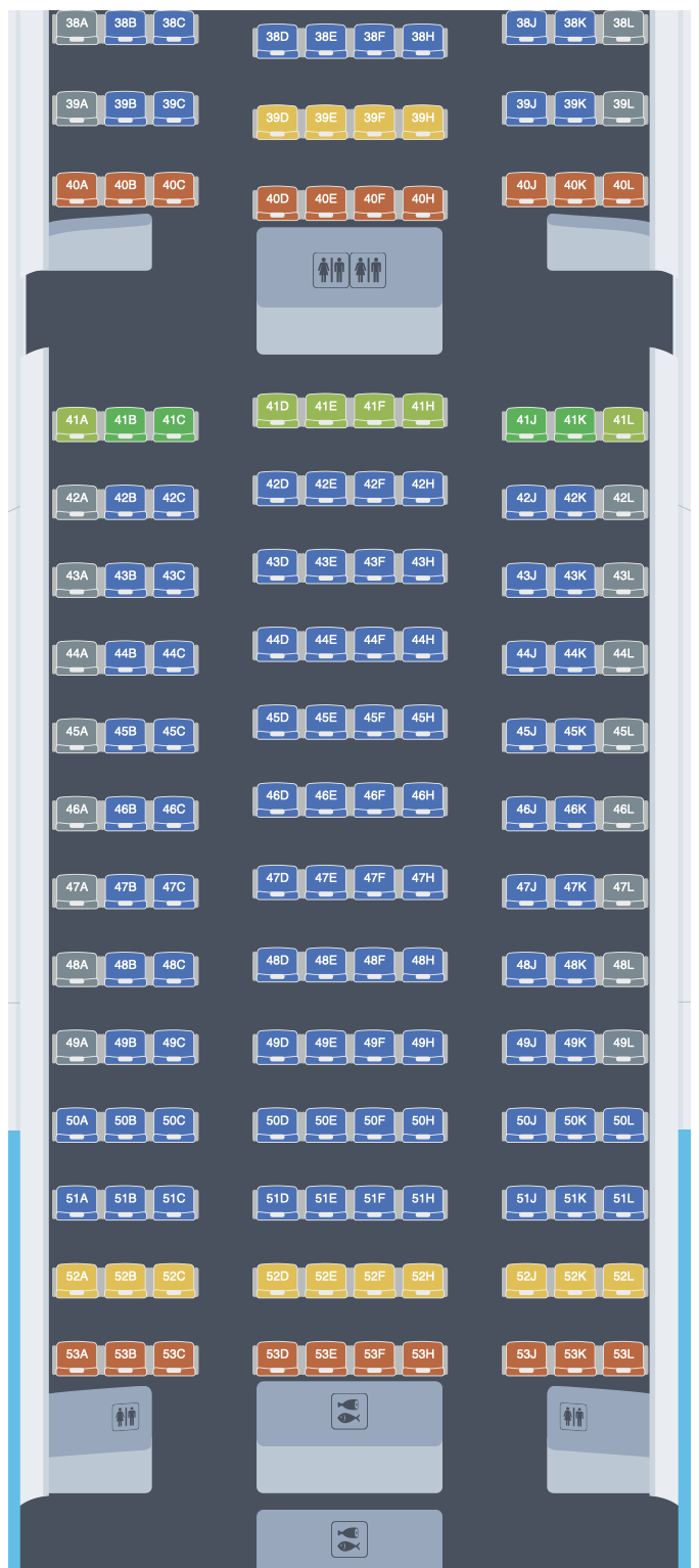 해당 비행편의 이코노미 좌석맵이다. 재미있는 점은 3-4-3 좌석배열이지만 재미있는 점은 비행기 뒤쪽으로 가면 2-4-2로 좌석배열이 변경된다. 11시간이 넘게 비행기에 있어야 하기에 옆에 한명이라도 작은 63AC와 64AC 좌석을 항공권 구매시 예약했었다. 예상대로 꽤 괜찮은 선택이었다. 특히 창가좌석과 좌석사이에 공간이 조금 있어서 가방이나 옷등을 사이에 넣어두기에 좋았다.
