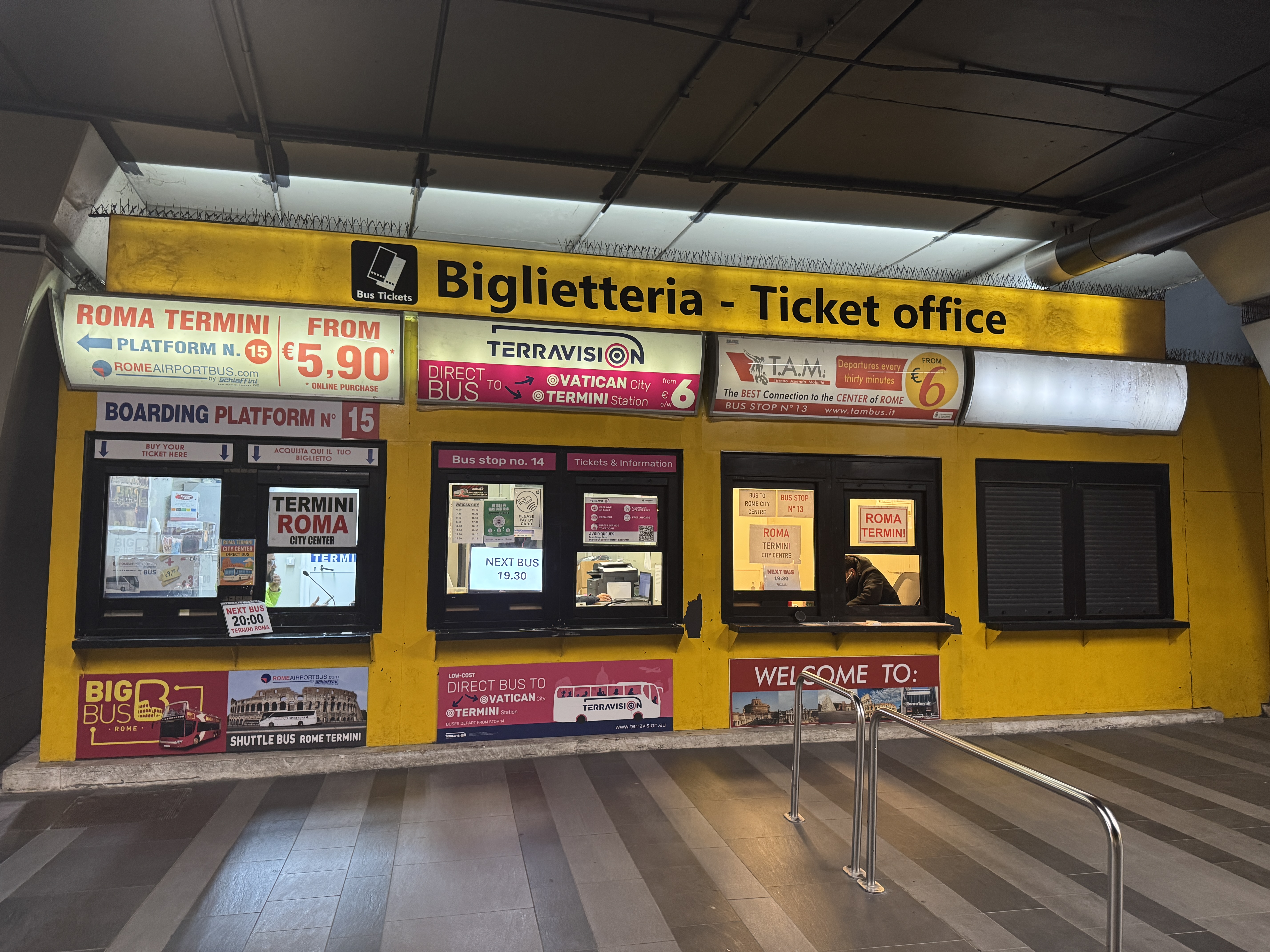 로마공항에서 시내로가는 버스는 아래와 같이 보통 3개 회사가 많이 사용되는 듯하다. 우리의 경우 짐나오길 기다리면서 terravision 웹페이지에서 온라인으로 결제했다. 겨울 비성수기에는 오프라인 창구에서 출발시간보고 빠른거 먼저 결제해도 충분한듯했다.